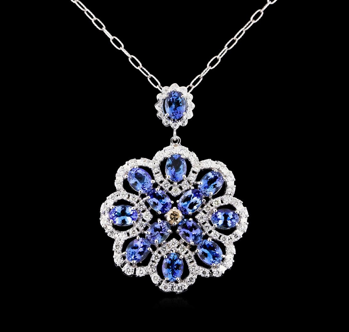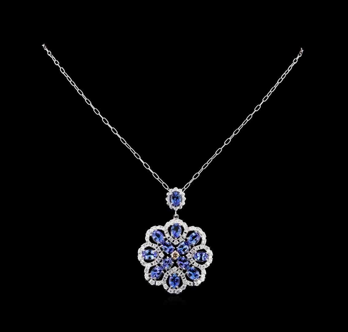 One electronically tested 14KT white gold lady's combination cast & assembled fashion pendant & chain 20.0" long, 2.5mm diamond cut cable link with a lobster claw clasp with a bright polish finish. The featured lady's pendant has a round motif measuring 43 millimeters in length. Identified with markings of "14K". Condition is new, good workmanship. Containing: Thirteen prong set oval modified brilliant cut natural tanzanites, measuring 8.00 x 5.95 x 4.05mm, (depth est.) approximate total weight of 17.65ct., clarity is eye clean, medium, very slightly grayish, bluish violet color, (GIA bV 5/3), cut is good. Transmitting light with no distortion, transparent. Colored gemstones are presumed to have been subjected to commonly used enhancement processes. Graded in the setting. One prong set round brilliant cut diamond, measuring 4.70 - 4.65 x 3.20mm (depth est.) approximate weight of 0.43ct. Graded in the setting. Clarity: SI-2 Cut Good Twelve prong set round brilliant cut diamonds, measuring 1.50 - 1.45 x 0.92mm (depth est.) approximate total weight of 12 Stones = 0.15ct. Graded in the setting. Clarity: VS-2 to SI-1. Color: G - Very Good Sixty prong set round brilliant cut diamonds, measuring 2.40 - 2.30 x 1.43mm (depth est.) approximate total weight of 60 Stones = 2.89ct. Graded in the setting. Clarity: SI-1 to SI-2. Color: H - I. Cut Good. Total Weight of Colored Stones 17.65ct. Total Weight of Diamonds 3.47ct. Total Weight of Pendant & Chain 24.80gm GAS Appraised at $22,510.00.