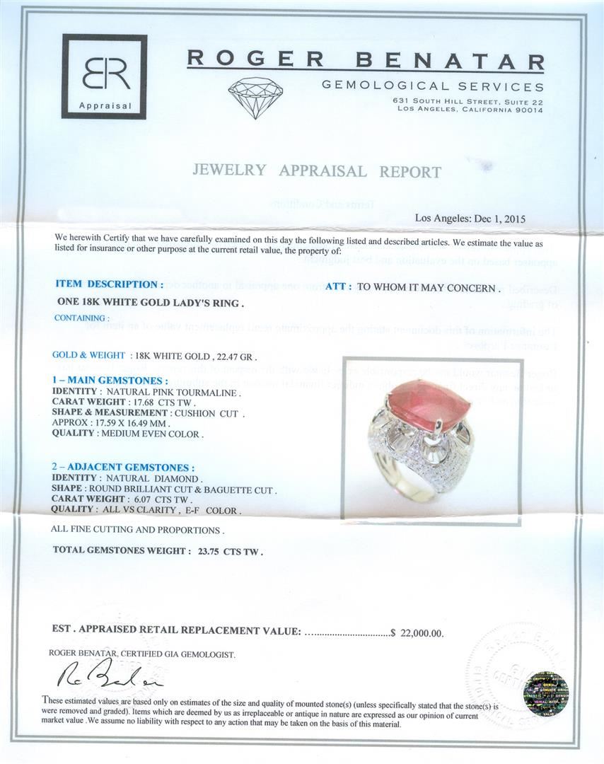 One 18KT White Gold Lady's Ring. Containing: Gold & Weight: 18K White Gold, 22.47 grams. Main Gemstones: Identity: Natural Pink Tourmaline. Carat Weight: 17.68 cts tw. Shape & Measurement: Cushion Cut. Approx: 17.59 x 16.49 mm. Quality: Medium Even Color. Adjacent Gemstones: Identity: Natural Diamond. Shape: Round Brilliant Cut & Baguette Cut. Carat Weight: 6.07 cts tw. Quality: All VS Clarity, E-F Color. All fine cutting and proportions. Total gemstones weight: 23.75 cts tw. RBGS Appraised at $22,000.00.