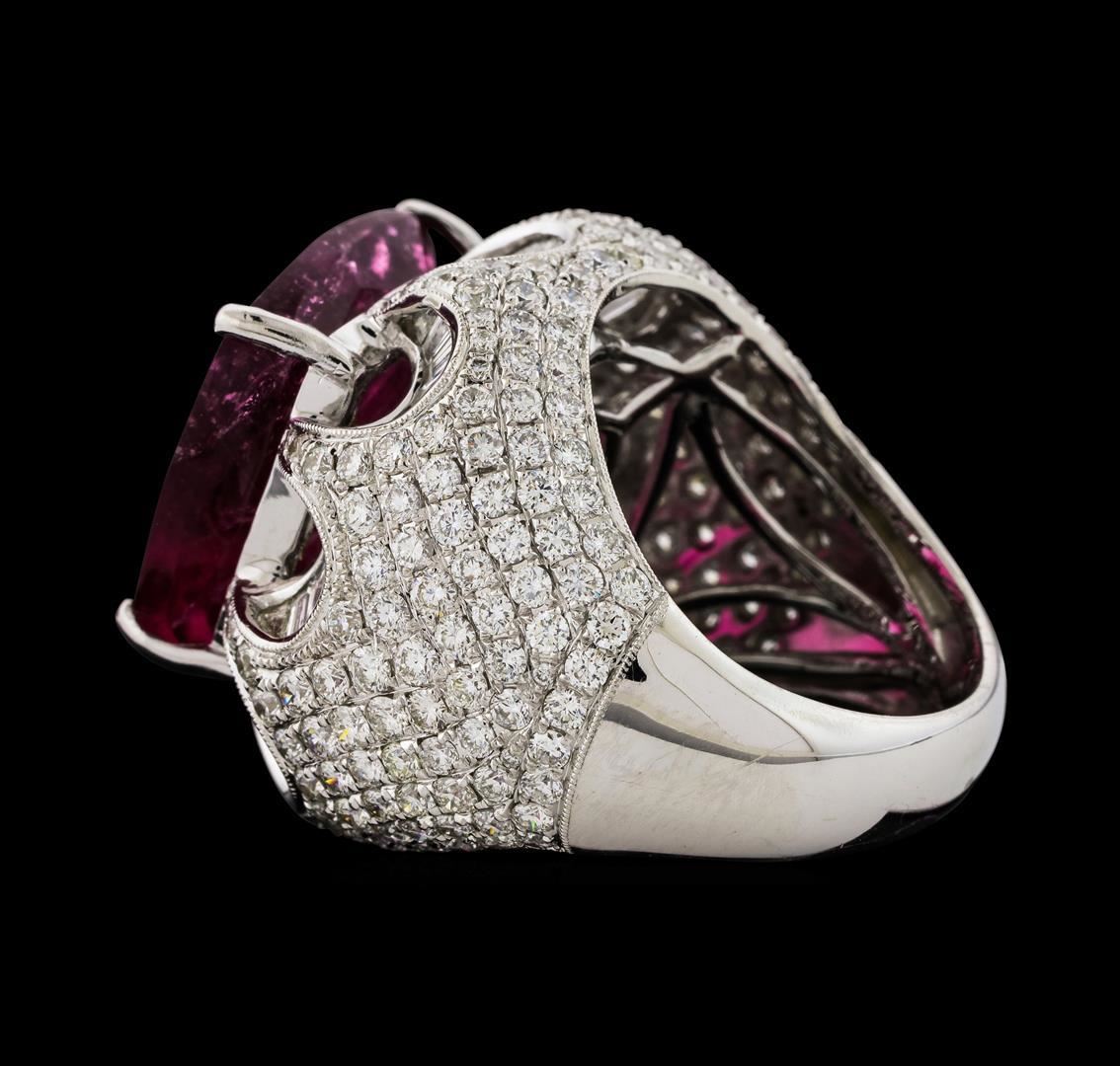 One 18KT White Gold Lady's Ring. Containing: Gold & Weight: 18K White Gold, 22.47 grams. Main Gemstones: Identity: Natural Pink Tourmaline. Carat Weight: 17.68 cts tw. Shape & Measurement: Cushion Cut. Approx: 17.59 x 16.49 mm. Quality: Medium Even Color. Adjacent Gemstones: Identity: Natural Diamond. Shape: Round Brilliant Cut & Baguette Cut. Carat Weight: 6.07 cts tw. Quality: All VS Clarity, E-F Color. All fine cutting and proportions. Total gemstones weight: 23.75 cts tw. RBGS Appraised.