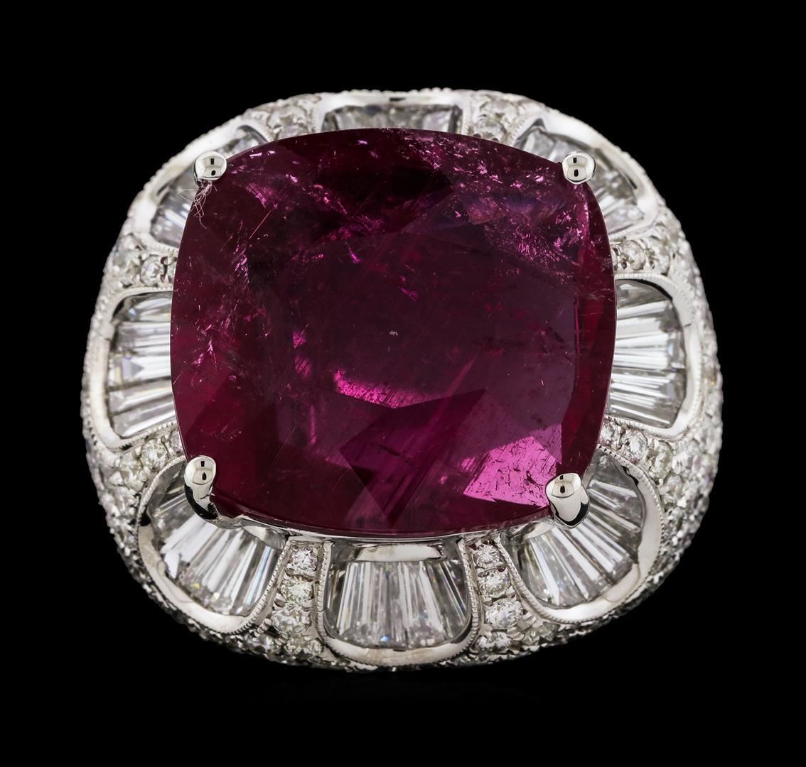 One 18KT White Gold Lady's Ring. Containing: Gold & Weight: 18K White Gold, 22.47 grams. Main Gemstones: Identity: Natural Pink Tourmaline. Carat Weight: 17.68 cts tw. Shape & Measurement: Cushion Cut. Approx: 17.59 x 16.49 mm. Quality: Medium Even Color. Adjacent Gemstones: Identity: Natural Diamond. Shape: Round Brilliant Cut & Baguette Cut. Carat Weight: 6.07 cts tw. Quality: All VS Clarity, E-F Color. All fine cutting and proportions. Total gemstones weight: 23.75 cts tw. RBGS Appraised.