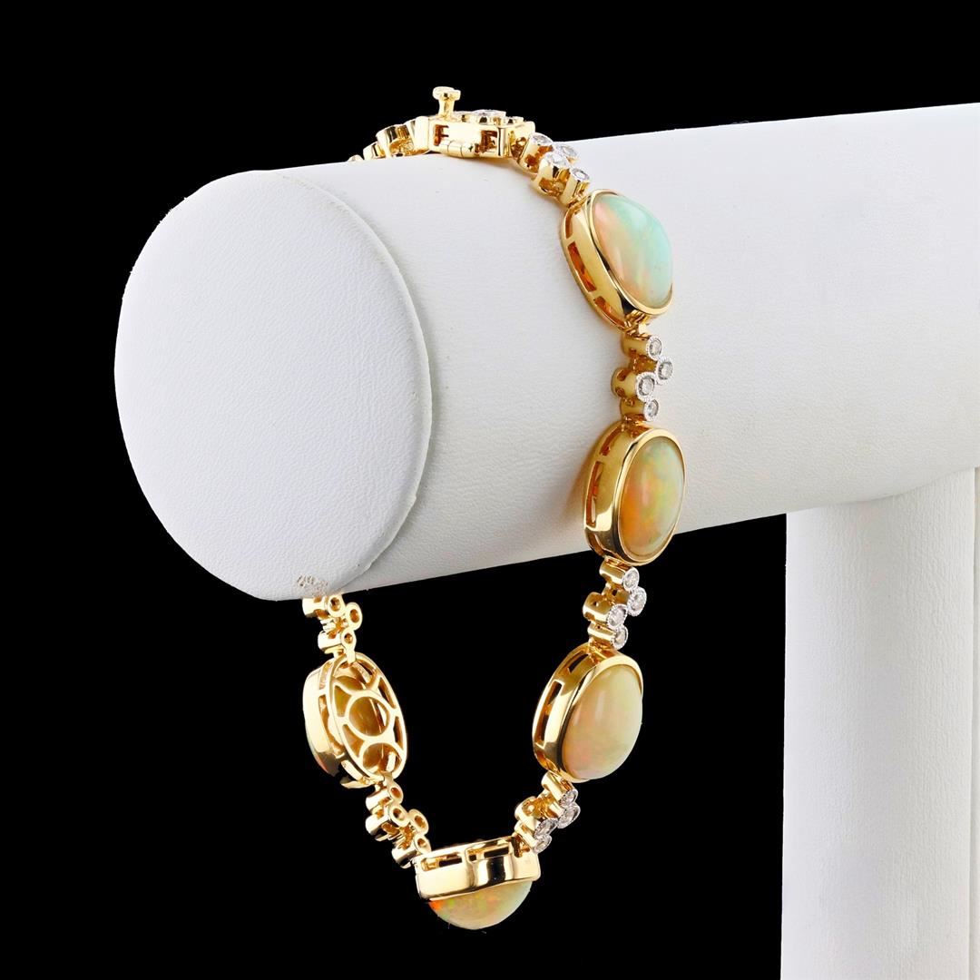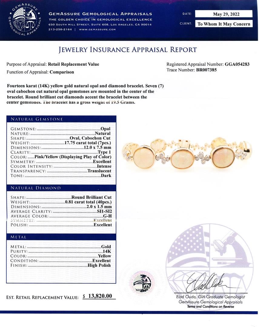 17.75ctw Opal and 0.81ctw Diamond 14K Yellow Gold Bracelet. Please see Photos and Description for all available information. This opal and diamond 14K yellow gold bracelet is a sophisticated and fashionable piece. The bracelet features 40 round brilliant cut diamonds and 7 natural opals. The diamonds weigh 0.81ct and the opal weighs 17.75ct.