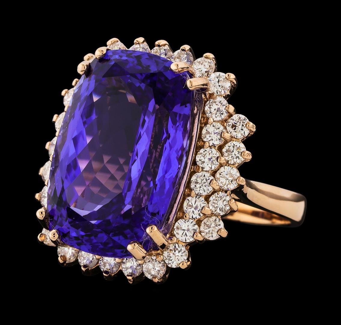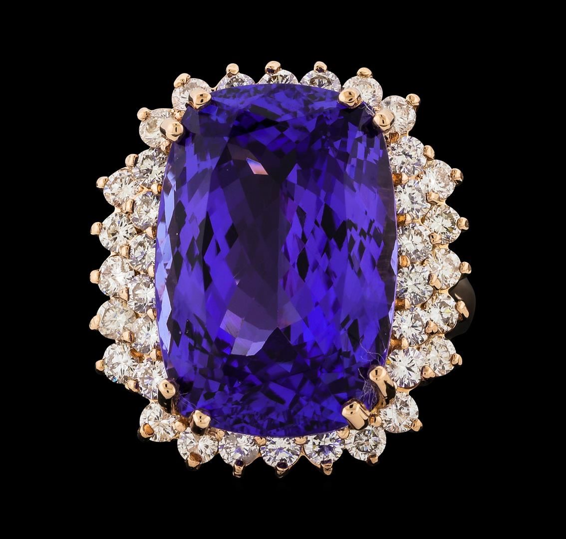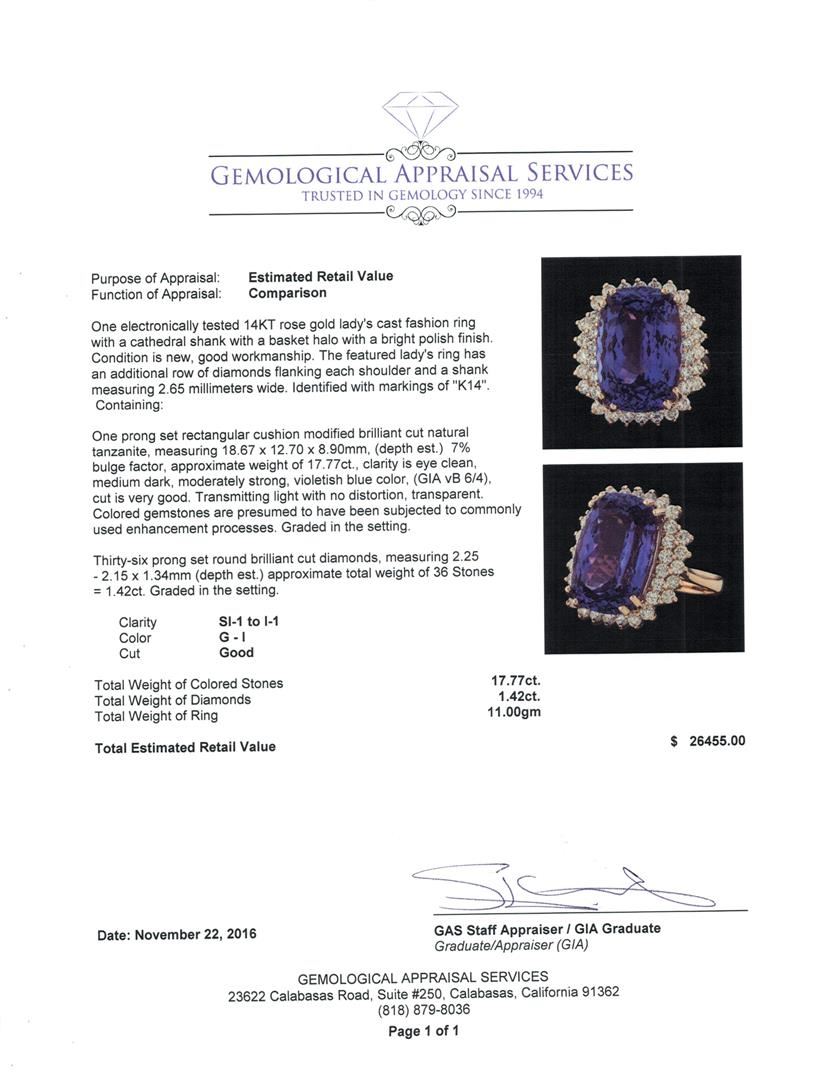 One electronically tested 14KT rose gold lady's cast fashion ring with a cathedral shank with a basket halo with a bright polish finish. The featured lady's ring has an additional row of diamonds flanking each shoulder and a shank measuring 2.65 millimeters wide. Identified with markings of 'K14'. Condition is new, good workmanship. Containing: One prong set rectangular cushion modified brilliant cut natural tanzanite, measuring 18.67 x 12.70 x 8.90mm, (depth est.) 7%. bulge factor, approximate weight of 17.77ct., clarity is eye clean, medium dark, moderately strong, violetish blue color, (GIA vB 6/4), cut is very good. Transmitting light with no distortion, transparent. Colored gemstones are presumed to have been subjected to commonly used enhancement processes. Graded in the setting. Thirty-Six prong set round brilliant cut diamonds, measuring 2.25 - 2.15 x 1.34mm (depth est.) approximate total weight of 36 Stones = 1.42ct. Graded in the setting. Clarity SI-1 to I-1. Color: G - I Cut Good. Total Weight of Colored Stones 17.77ct.. Total Weight of Diamonds 1.42ct.. Total Weight of Ring 11.00gm. GAS Appraised at $26,455.00.