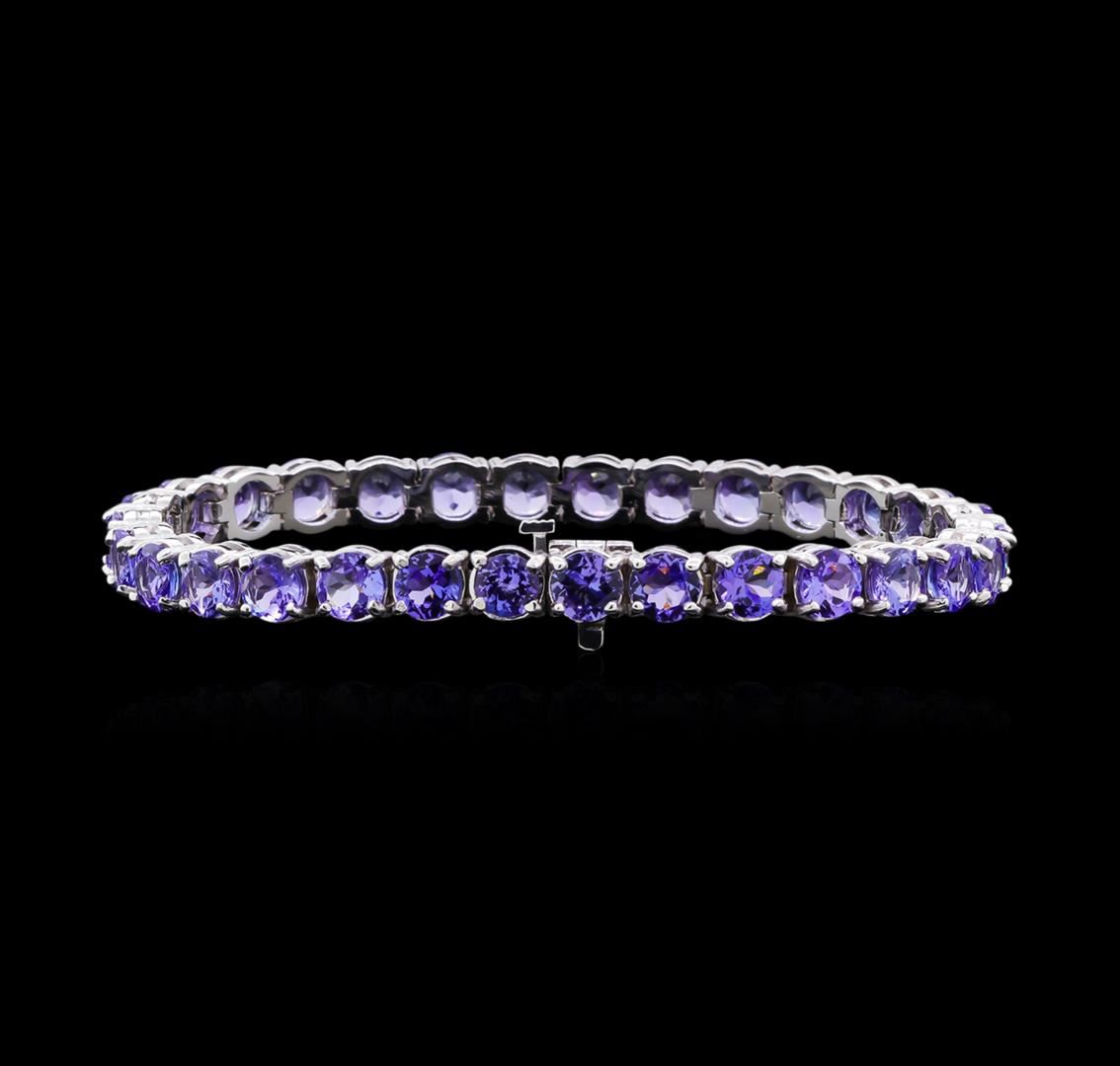 One electronically tested 14KT white gold lady's combination cast & assembled fashion straight line bracelet with a tongue clasp with foldover safety with a bright polish finish. The featured lady's bracelet measures 7 inches in length. Identified with markings of "14K". Condition is new, good workmanship. Containing: Thirty prong set round brilliant cut natural tanzanites, measuring 5.60 - 5.30 x 2.85 mm, (depth est.) approximate total weight of 17.78ct., clarity is eye clean, medium, moderately strong, violetish blue color, (GIA vB 5/4), cut is good. Transmitting light with no distortion, transparent. Colored gemstones are presumed to have been subjected to commonly used enhancement processes. Graded in the setting. Total Weight of Colored Stones 17.78ct. Total Weight of Straight Line Bracelet 23.70gm. GAS Appraised at $12,385.00.