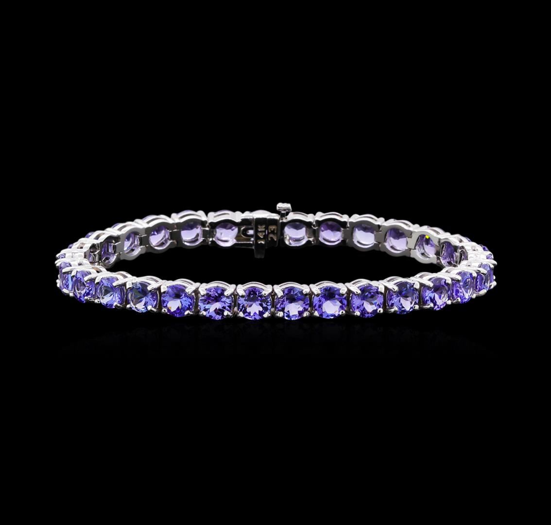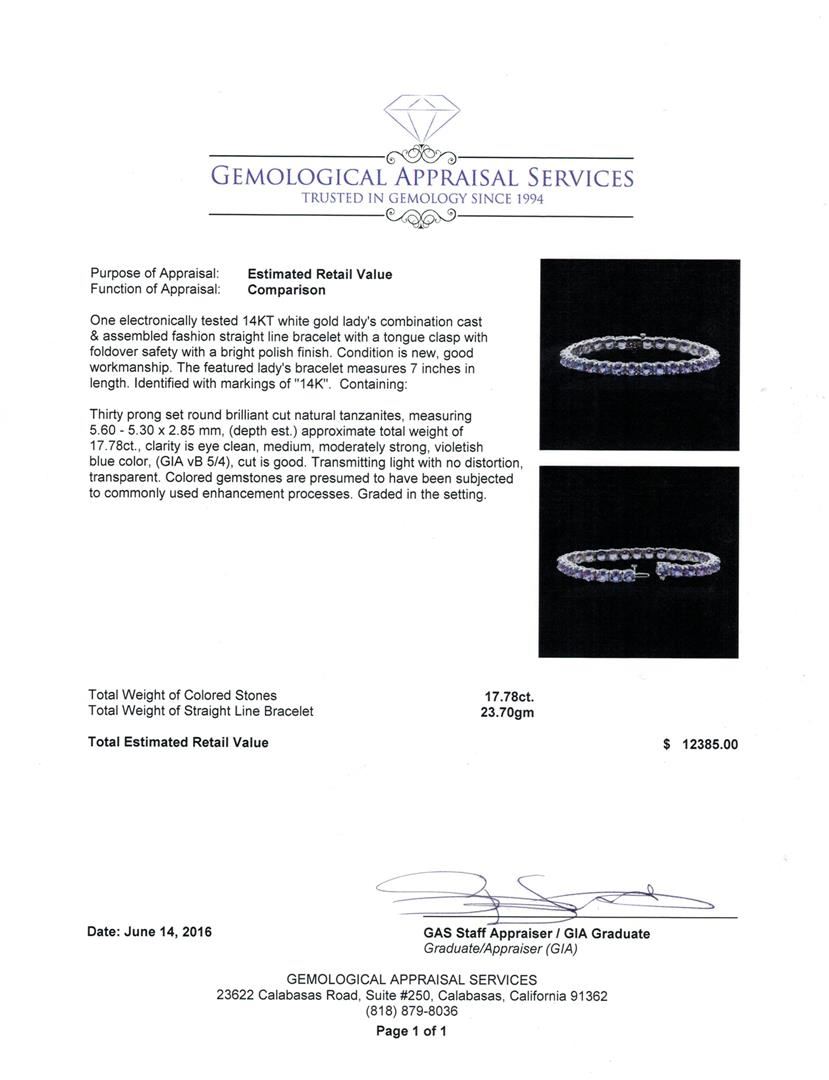 One electronically tested 14KT white gold lady's combination cast & assembled fashion straight line bracelet with a tongue clasp with foldover safety with a bright polish finish. The featured lady's bracelet measures 7 inches in length. Identified with markings of "14K". Condition is new, good workmanship. Containing: Thirty prong set round brilliant cut natural tanzanites, measuring 5.60 - 5.30 x 2.85 mm, (depth est.) approximate total weight of 17.78ct., clarity is eye clean, medium, moderately strong, violetish blue color, (GIA vB 5/4), cut is good. Transmitting light with no distortion, transparent. Colored gemstones are presumed to have been subjected to commonly used enhancement processes. Graded in the setting. Total Weight of Colored Stones 17.78ct. Total Weight of Straight Line Bracelet 23.70gm. GAS Appraised at $12,385.00.