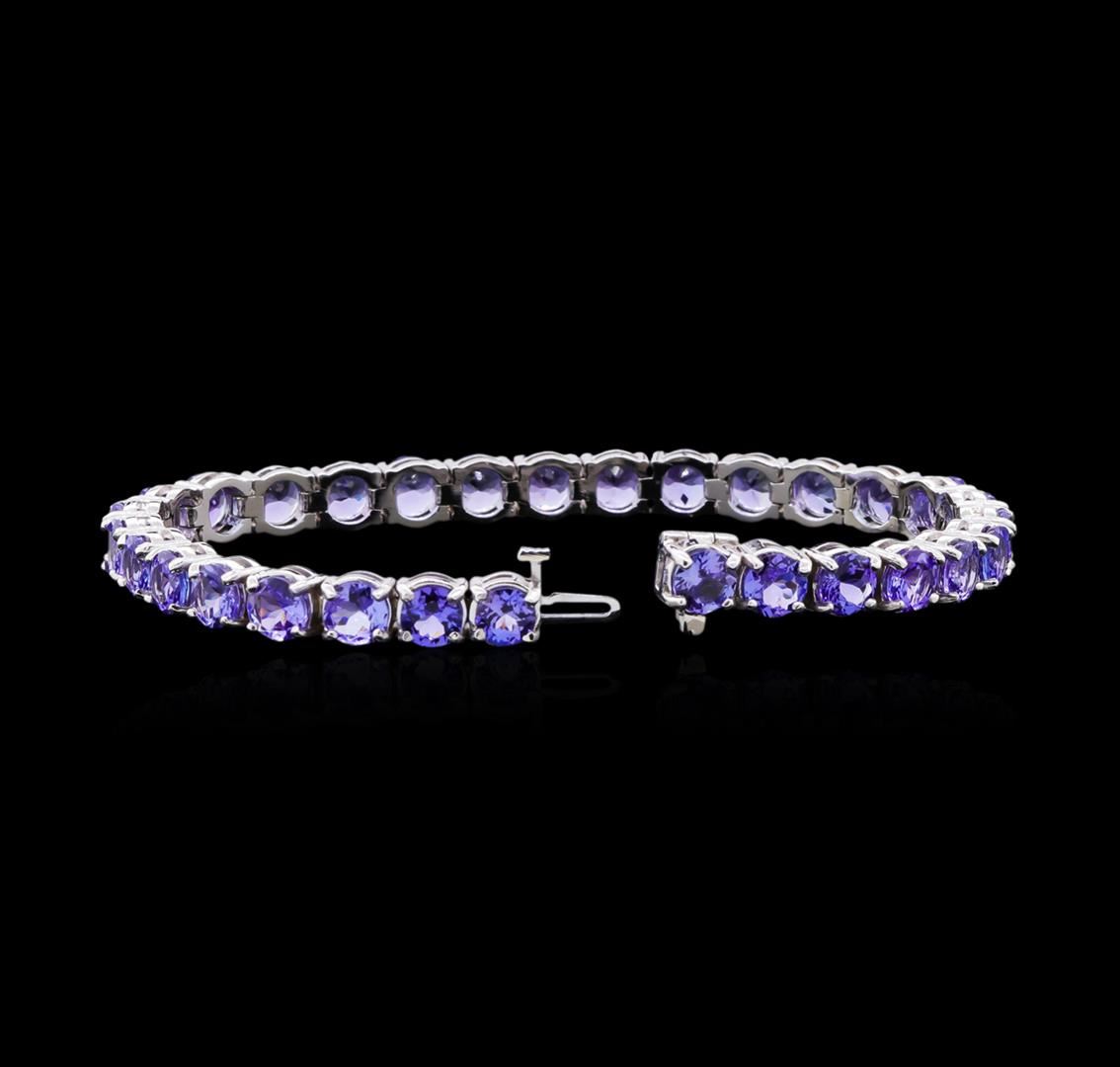 One electronically tested 14KT white gold lady's combination cast & assembled fashion straight line bracelet with a tongue clasp with foldover safety with a bright polish finish. The featured lady's bracelet measures 7 inches in length. Identified with markings of "14K". Condition is new, good workmanship. Containing: Thirty prong set round brilliant cut natural tanzanites, measuring 5.60 - 5.30 x 2.85 mm, (depth est.) approximate total weight of 17.78ct., clarity is eye clean, medium, moderately strong, violetish blue color, (GIA vB 5/4), cut is good. Transmitting light with no distortion, transparent. Colored gemstones are presumed to have been subjected to commonly used enhancement processes. Graded in the setting. Total Weight of Colored Stones 17.78ct. Total Weight of Straight Line Bracelet 23.70gm. GAS Appraised at $12,385.00.