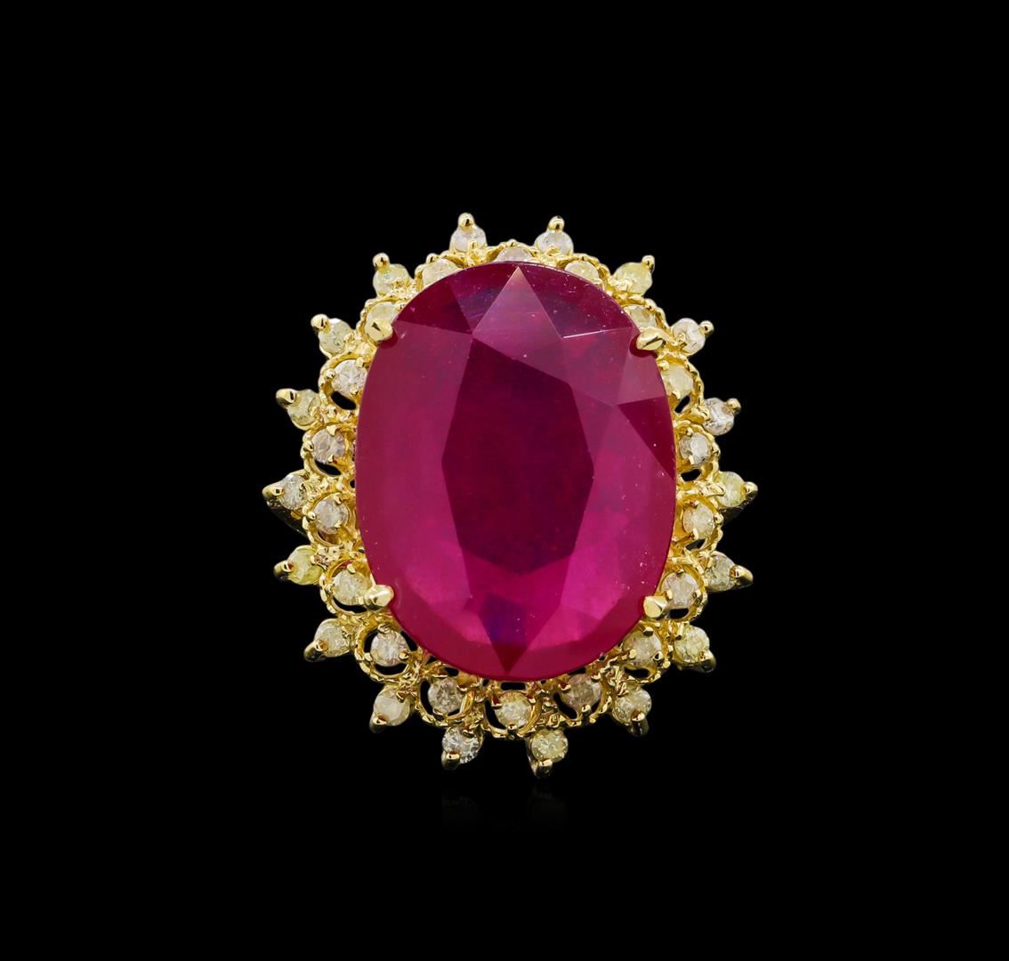 One electronically tested 14KT yellow gold ladies cast ruby and diamond ring with a bright polish with milgrain finish. The featured ruby is set within a floral diamond bezel, completed by a two millimeter wide band. Identified with markings of "K14". Condition is new, good workmanship. Containing: One prong set oval mixed cut natural ruby, measuring 19.60 x 14.75 x 8.85mm, approximate weight of 17.87ct., clarity is heavily included, type II, medium dark, moderately strong, slightly purplish red color, (GIA slpR 6/4), cut is good. Transmitting light somewhat diffusely, transparent to translucent. Naturally occurring internal & external characteristics are present. Indications of laboratory high temperature heat treatment, with glass & flux additives. Graded in the setting. Ruby has a low tolerance to rhodium plating, repolishing the surface, & ultrasonic cleaning. Thirty-Six prong set round brilliant cut diamonds, measuring 1.80 - 1.70 x 1.05mm (depth est.) approximate total weight of 36 Stones = 0.75ct. Graded in the setting. Clarity: I-2 to I-3. Color: J - L. Total Weight of Colored Stones 17.87ct. Total Weight of Diamonds 0.75ct. Total Weight of Ring 10.00gm. AIG Appraised at $7,075.00.