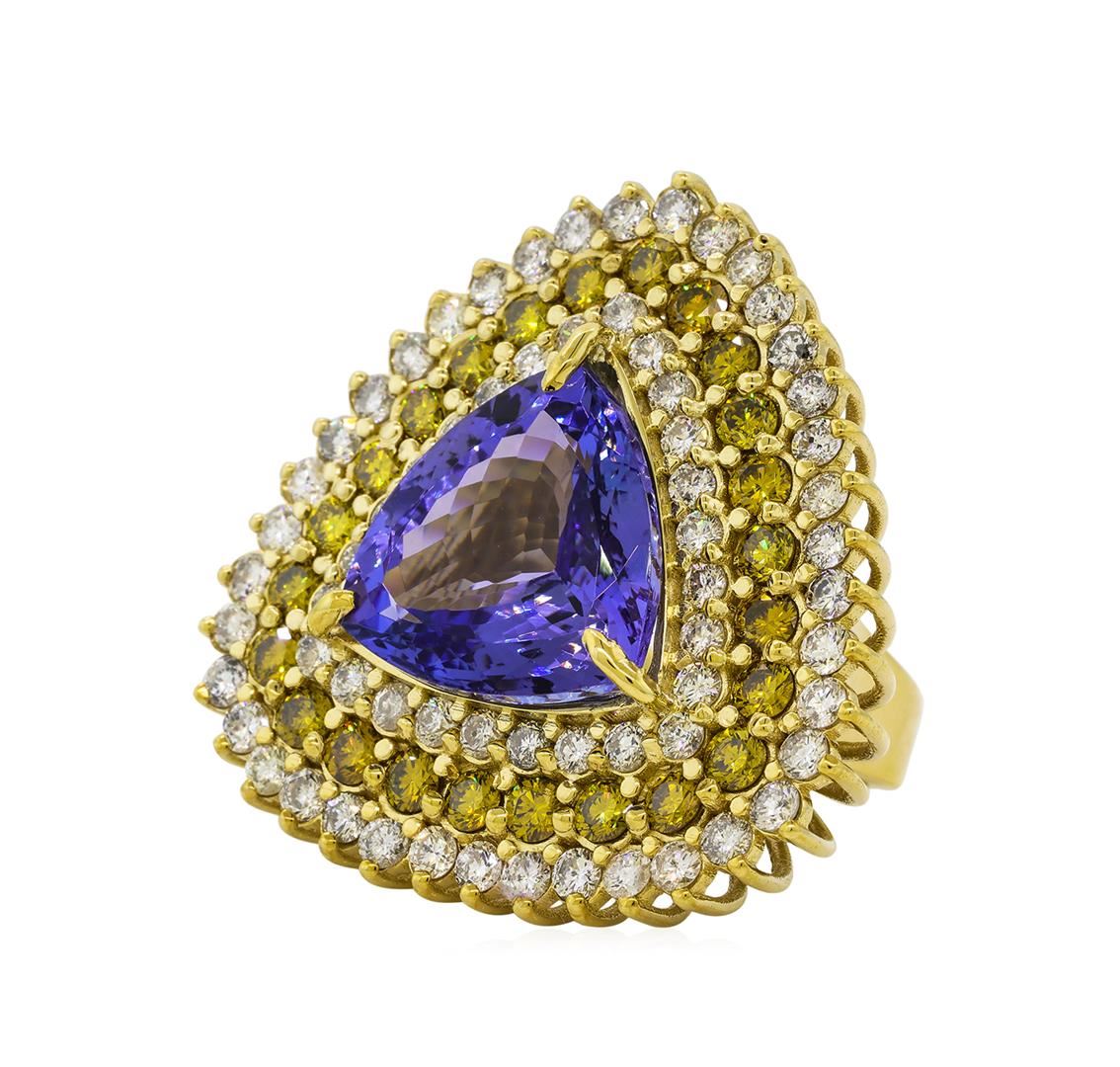 One electronically tested 14KT yellow gold ladies cast tanzanite and diamond ring. The featured tanzanite is set within a yellow and white diamond ribbon frame supported by a ribbed under gallery, completed by a three millimeter wide band, Bright polish finish. Identified with markings of '14K'. Condition is new, good workmanship. Containing: One prong set triangle mixed cut natural tanzanite, measuring 16.50 x 17.00 x 9.00mm, approximate weight of 17.94ct., clarity is eye clean, type I, medium, slightly grayish, violet color, (GIA V 5/2), cut is good. Transmitting light with no distortion, transparent. Colored Stone Grading Report attached. Graded in the setting. Tanzanite is a very rare gemstone that is only found in the country of Tanzania. Originally discovered in 1967. Tiffany & Company, named the stone Tanzanite. It is found in the Usumburu Mountains that border the Umba Valley of northern Tanzania. Tanzanite occurs in gray, brown, violet, blue, reddish-purple, & green. The gem is interesting because of its exceptional pleochroism. Rotated in different directions a tanzanite will exhibit multiple changes of color. Tanzanite has a low tolerance to ultrasonic cleaning, and should not be cleaned using this method. Twenty-Four prong set round brilliant cut diamonds, measuring 3.00 - 3.00 x 1.80mm (depth est.) approximate total weight of 24 Stones = 2.37ct. Indications of laboratory irradiated enhanced color. Measurements & the color grade are an average for the group. Graded in the setting. Clarity VS-2 Sixty-Six prong set round brilliant cut diamonds, measuring 2.50 - 2.30 x 1.44mm (depth est.) approximate total weight of 66 Stones = 3.71ct. Graded in the setting. Clarity SI-2 to I-2. Color: F - H. Total Weight of Colored Stones 17.94ct.. Total Weight of Diamonds 6.08ct.. Total Weight of Ring 27.29gm. AIG Appraised at $49,475.00.