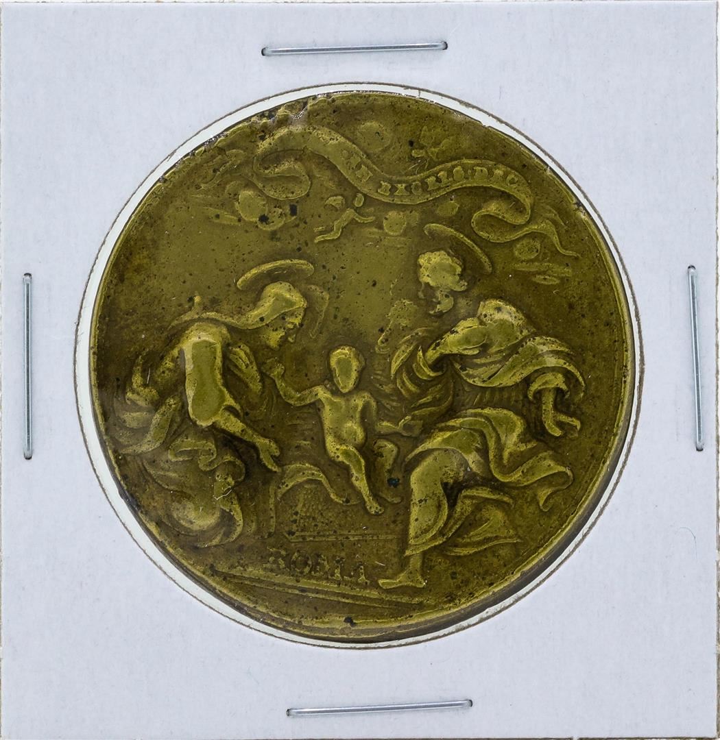 One Brass, cast, approx. 39mm across, lovely old religious medal, depicts nativity tools and signs of the passion of Jesus. PASS ME CHRIS CONFORT.