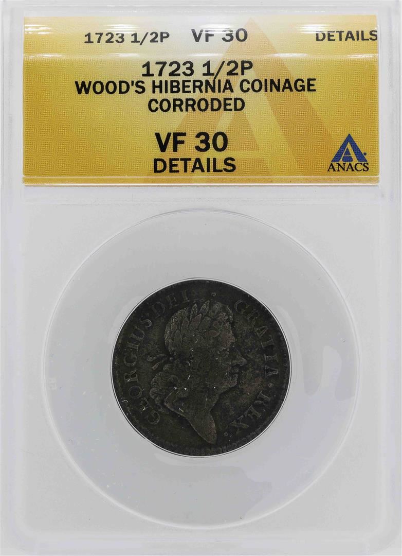 One 1723 Wood's Hibernia 1/2 Penny Coin ANACS VF30 Details. ANACS Appraised.