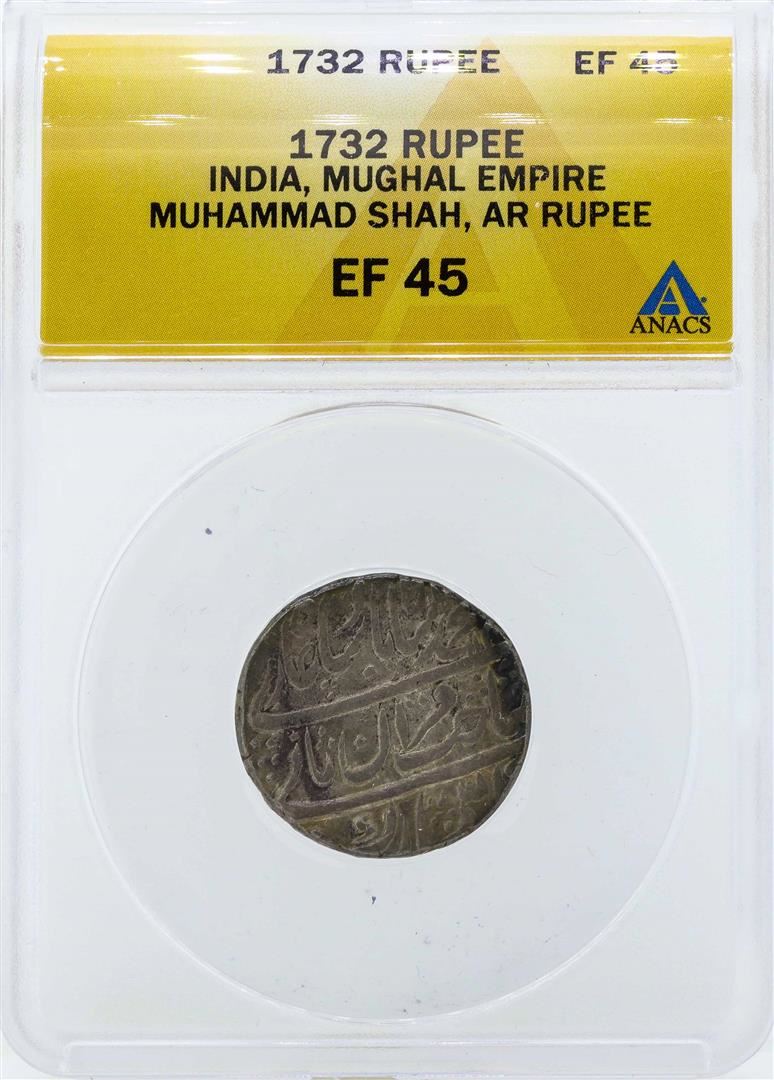 One 1732 India Rupee Mughal Empire Coin ANACS EF45. ANACS Appraised.