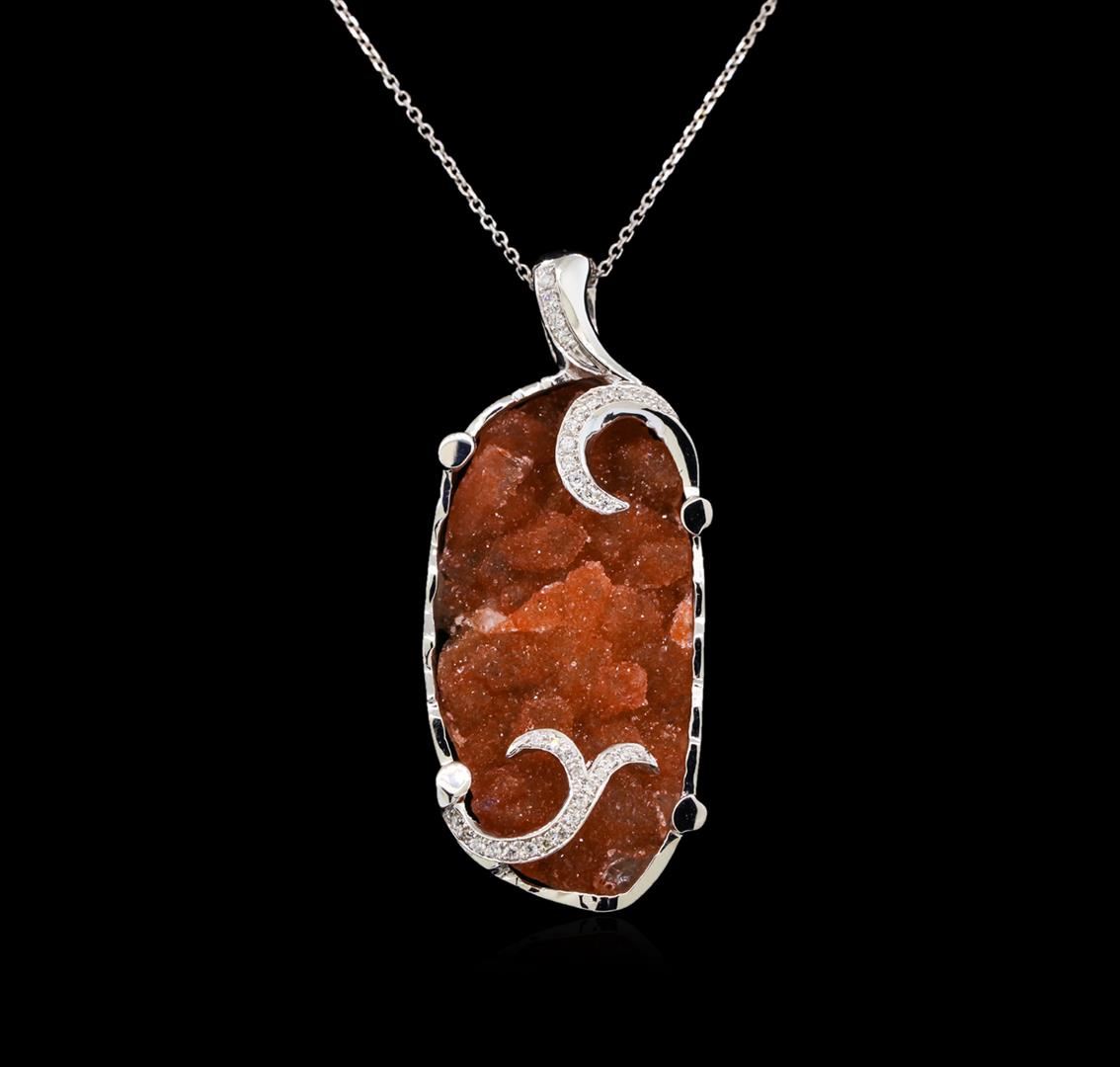 One electronically tested 14KT white gold lady's cast fashion pendant & chain 18.0' long, 1mm diamond cut oval cable link with a spring ring clasp with a bright polish finish. Identified with markings of '14K'. Condition is new, good workmanship. Containing: One free-form cut natural citrine quartz, measuring 30.00 x 15.00 x 4.00mm, (depth est.) approximate weight of 18.00ct.The featured citrine quartz has a brownish orange hue and contains crystalline structures. Graded in the setting. Thirty-Five bead set round brilliant cut diamonds, measuring 1.30 - 1.20 x 0.78mm (depth est.) approximate total weight of 35 Stones = 0.26ct. Graded in the setting. Clarity SI-1 to SI-2. Color: G - H Cut Good. Total Weight of Colored Stones 18.00ct.. Total Weight of Diamonds 0.26ct.. Total Weight of Pendant & Chain 8.60gm. GAS Appraised at $2,950.00.