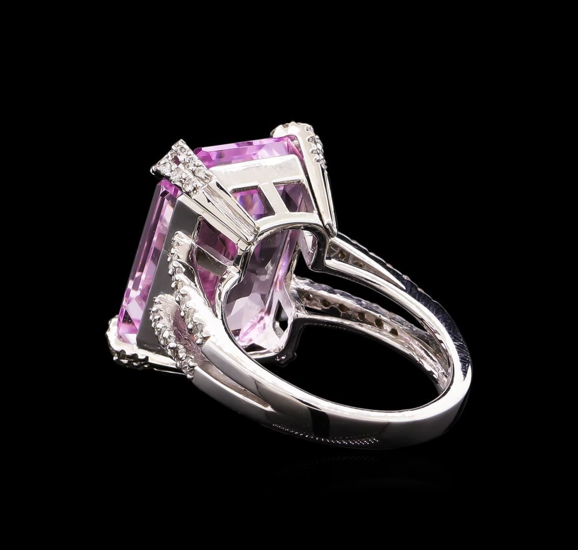 One electronically tested 18KT white gold lady's cast fashion ring with a split shank with a bright polish finish. The featured lady's ring has a shank measuring 2.92 millimeters wide. Identified with markings of "750". Condition is new, good workmanship. Containing: One prong set emerald step cut natural kunzite, measuring 18.10 x 13.96 x 7.90mm, 5%. bulge factor, approximate weight of 18.00ct., clarity is eye clean, type I, light, moderately strong, reddish purple color, (GIA rP 3/4), cut is very good. Transmitting light with no distortion, transparent. Colored gemstones are presumed to have been subjected to commonly used enhancement processes. Graded in the setting. Twenty-Eight prong set round brilliant cut diamonds, measuring 1.50 - 1.40 x 0.90mm (depth est.) approximate total weight of 28 Stones = 0.32ct. Graded in the setting. Clarity: SI-2 to I-1. Color: G - Good Fifty-Two prong set round brilliant cut diamonds, measuring 1.10 - 1.00 x 0.65mm (depth est.) approximate total weight of 52 Stones = 0.23ct. Graded in the setting. Clarity: SI-2 to I-1. Color: G - Good. Total Weight of Colored Stones 18.00ct. Total Weight of Diamonds 0.55ct. Total Weight of Ring 11.00gm. GAS Appraised at $8,575.00.