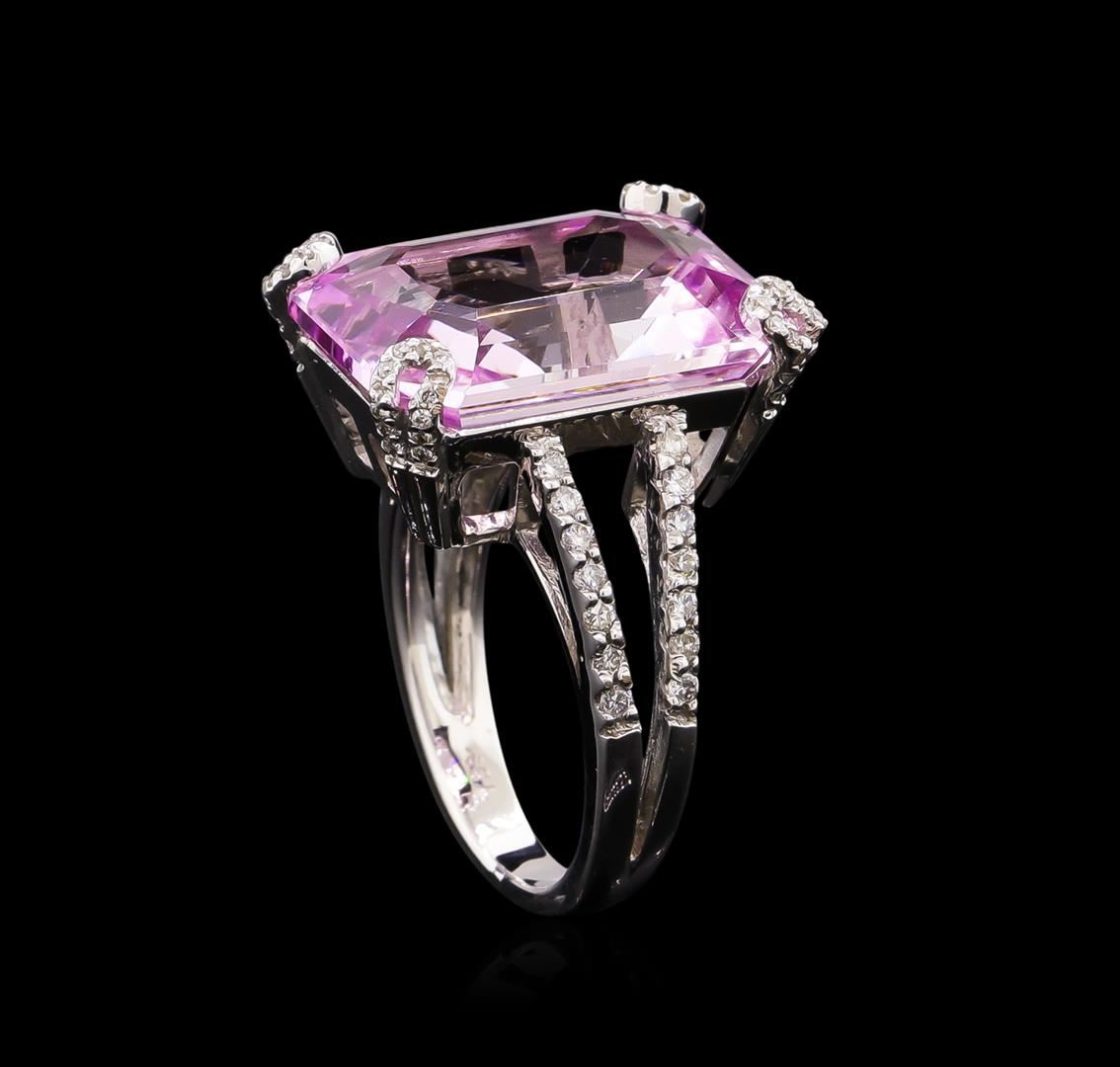 One electronically tested 18KT white gold lady's cast fashion ring with a split shank with a bright polish finish. The featured lady's ring has a shank measuring 2.92 millimeters wide. Identified with markings of "750". Condition is new, good workmanship. Containing: One prong set emerald step cut natural kunzite, measuring 18.10 x 13.96 x 7.90mm, 5%. bulge factor, approximate weight of 18.00ct., clarity is eye clean, type I, light, moderately strong, reddish purple color, (GIA rP 3/4), cut is very good. Transmitting light with no distortion, transparent. Colored gemstones are presumed to have been subjected to commonly used enhancement processes. Graded in the setting. Twenty-Eight prong set round brilliant cut diamonds, measuring 1.50 - 1.40 x 0.90mm (depth est.) approximate total weight of 28 Stones = 0.32ct. Graded in the setting. Clarity: SI-2 to I-1. Color: G - Good Fifty-Two prong set round brilliant cut diamonds, measuring 1.10 - 1.00 x 0.65mm (depth est.) approximate total weight of 52 Stones = 0.23ct. Graded in the setting. Clarity: SI-2 to I-1. Color: G - Good. Total Weight of Colored Stones 18.00ct. Total Weight of Diamonds 0.55ct. Total Weight of Ring 11.00gm. GAS Appraised at $8,575.00.
