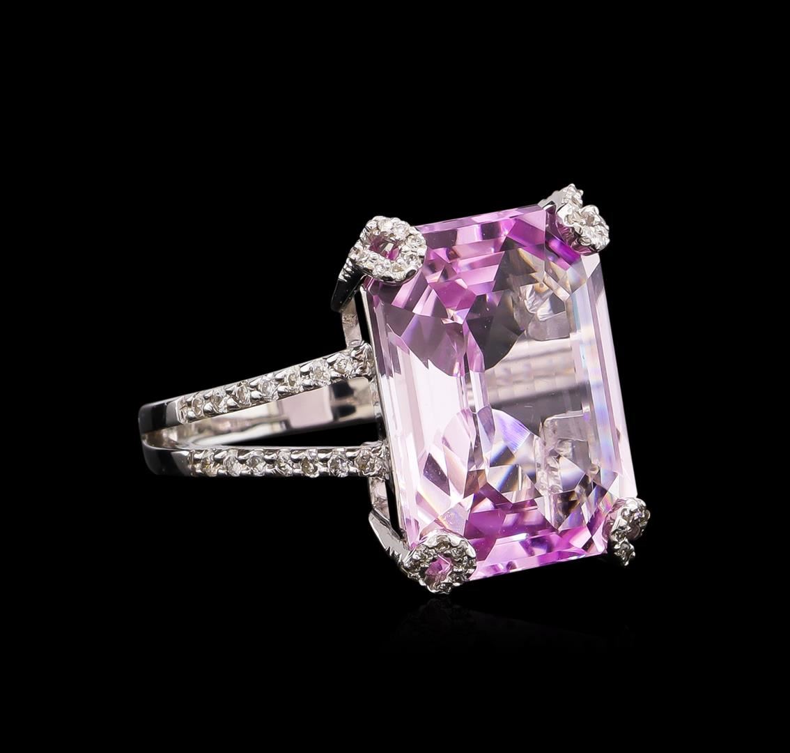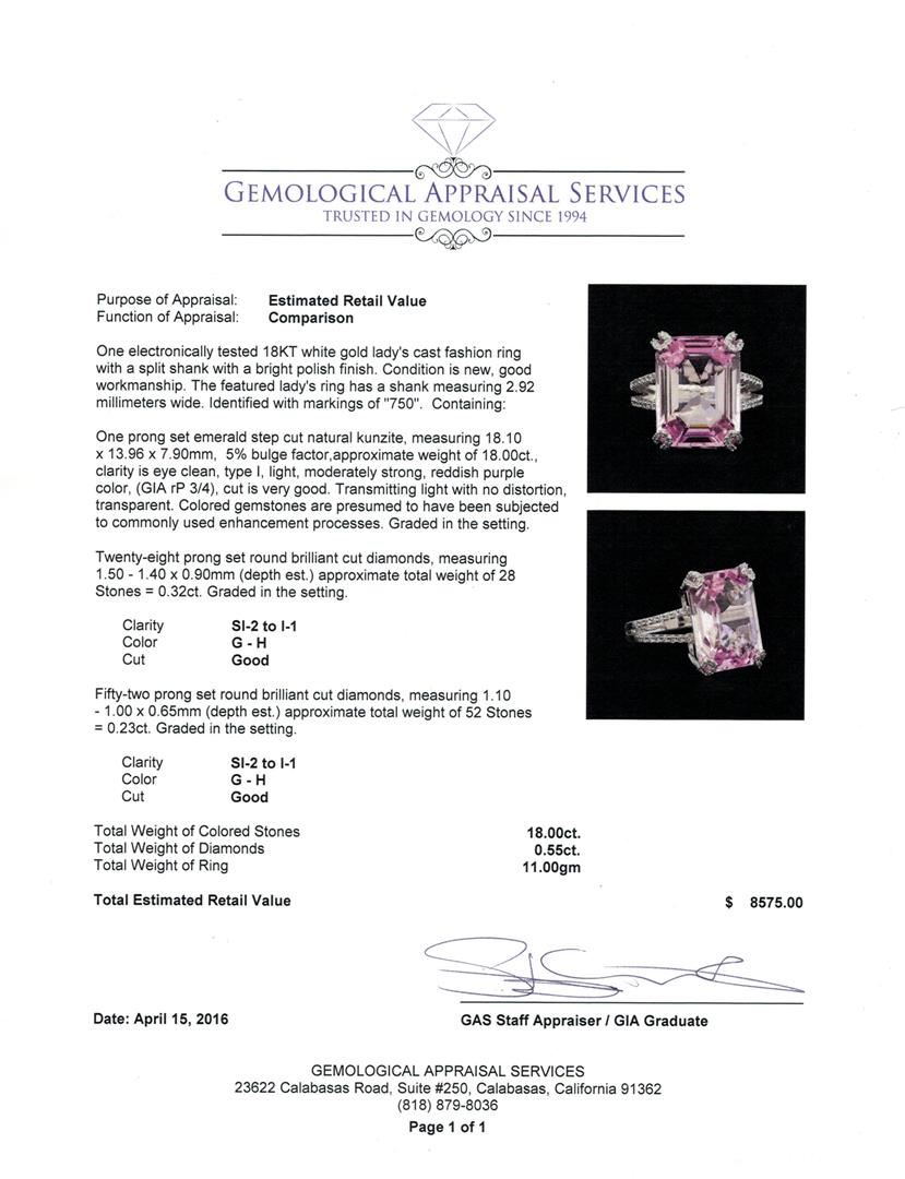 One electronically tested 18KT white gold lady's cast fashion ring with a split shank with a bright polish finish. The featured lady's ring has a shank measuring 2.92 millimeters wide. Identified with markings of "750". Condition is new, good workmanship. Containing: One prong set emerald step cut natural kunzite, measuring 18.10 x 13.96 x 7.90mm, 5%. bulge factor, approximate weight of 18.00ct., clarity is eye clean, type I, light, moderately strong, reddish purple color, (GIA rP 3/4), cut is very good. Transmitting light with no distortion, transparent. Colored gemstones are presumed to have been subjected to commonly used enhancement processes. Graded in the setting. Twenty-Eight prong set round brilliant cut diamonds, measuring 1.50 - 1.40 x 0.90mm (depth est.) approximate total weight of 28 Stones = 0.32ct. Graded in the setting. Clarity: SI-2 to I-1. Color: G - Good Fifty-Two prong set round brilliant cut diamonds, measuring 1.10 - 1.00 x 0.65mm (depth est.) approximate total weight of 52 Stones = 0.23ct. Graded in the setting. Clarity: SI-2 to I-1. Color: G - Good. Total Weight of Colored Stones 18.00ct. Total Weight of Diamonds 0.55ct. Total Weight of Ring 11.00gm. GAS Appraised at $8,575.00.
