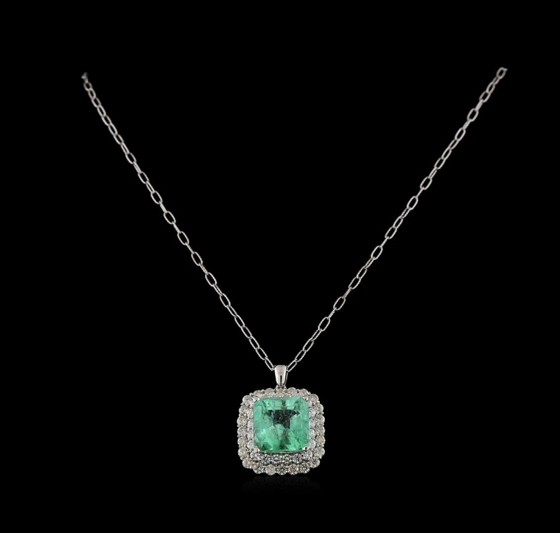 One electronically tested 14KT white gold lady's combination cast & assembled fashion pendant & chain 20.0' long, 2.5mm twisted oval cable link with a lobster claw clasp with a double basket halo with a bright polish finish. Identified with markings of '14K'. Condition is new, good workmanship. Containing: One prong set emerald standard step cut natural emerald, measuring 15.60 x 15.46 x 10.89mm, (depth est.) approximate weight of 18.09ct., clarity is moderately included, medium light, very slightly grayish, green color, (GIA G 4/3), cut is good. Transmitting light somewhat diffusely, transparent to translucent. Naturally occurring internal & external characteristics are present. Indications of oil residue. Clarity enhanced. Colored gemstones are presumed to have been subjected to commonly used enhancement processes. Graded loose prior to setting in the GIA Laboratory, Report #5171668662. Twenty-Four prong set round brilliant cut diamonds, measuring 3.10 - 3.00 x 1.86mm (depth est.) approximate total weight of 24 Stones = 2.52ct. Graded in the setting. Clarity SI-1 to SI-2. Color: I - J Cut Good Twenty prong set round brilliant cut diamonds, measuring 2.80 - 2.70 x 1.71mm (depth est.) approximate total weight of 20 Stones = 1.57ct. Graded in the setting. Clarity SI-1 to SI-2. Color: H - I Cut Good. Total Weight of Colored Stones 18.09ct.. Total Weight of Diamonds 4.09ct.. Total Weight of Pendant & Chain 18.40gm GAS Appraised at $21,765.00.