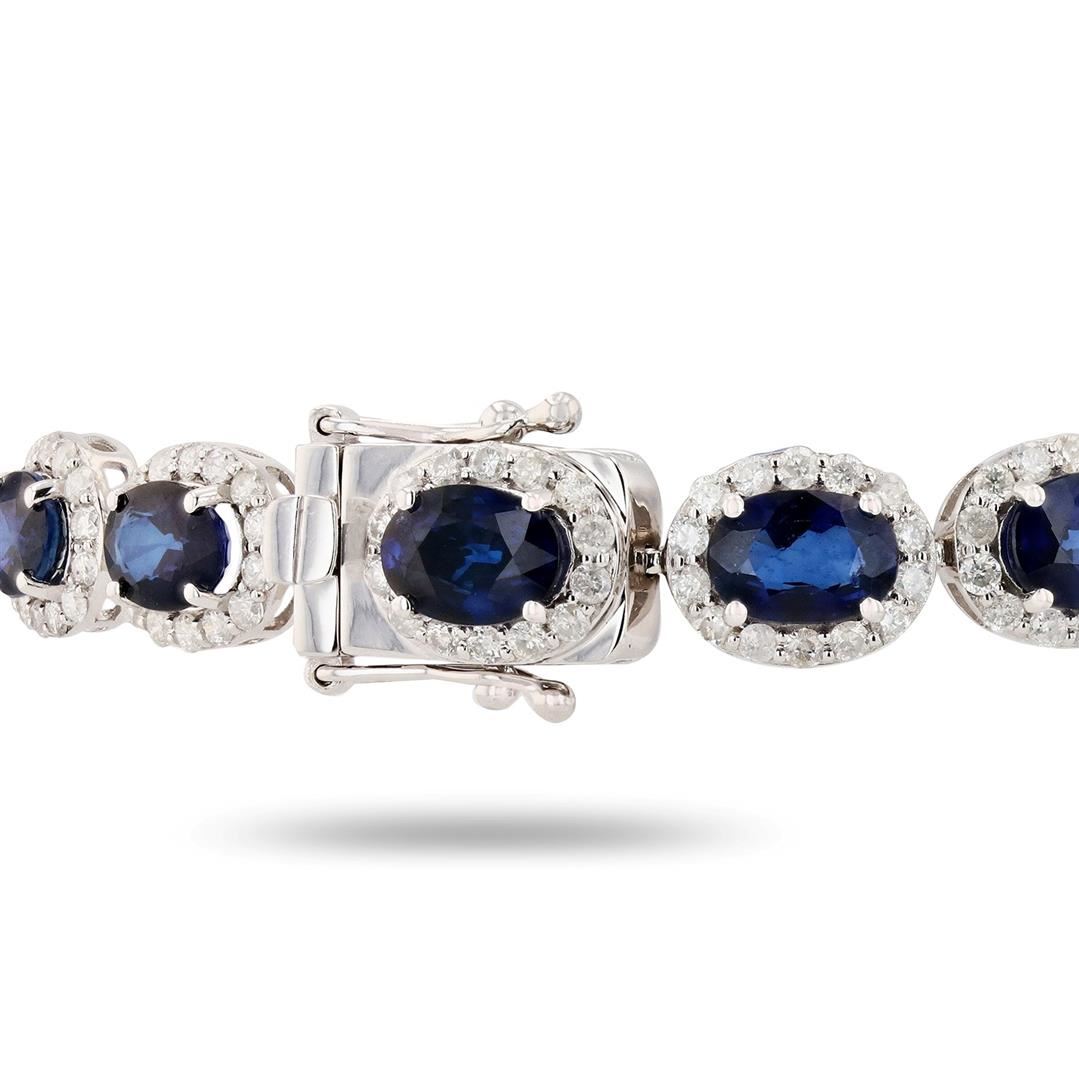 ONE 14K WHITE GOLD LADY'S CUSTOM DIAMOND AND BLUE SAPPHIRE BRACELET. 16.80 GR TW. 7.5" LONG. CONTAINING 1- MAIN CENTERSTONE(S): IDENTITY: 18 COUNTS NATURAL SAPPHIRE SET IN 4 PRONGS SETTING. CARAT WEIGHT: 18.13 CTS. 18 COUNTS. SHAPE AND MEASUREMEMT: OVAL CUT. FROM APPROX 7 X 5 MM. QUALITY: "DIFFUSED" QUALITY BLUE SAPPHIRE, FINE CUT AND CLARITY. PERMANENT TREATEMENT 2- ADJACENT GEMSTONES IDENTITY: NATURAL DIAMONDS. SHAPE: ROUND BRILLIANT CUT. CARAT WEIGHT: 3.92 CTS. QUALITY: G-H COLOR, I CLARITY. ALL FINE CUTTING AND PROPORTIONS. ALL PRONGS SETTINGS STYLE TOTAL GEMSTONES WEIGHT: 22.05 CTS TW.
