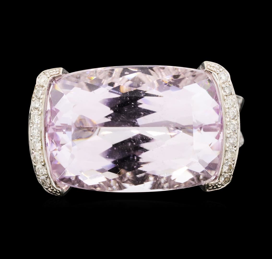 One electronically tested 18KT white gold lady's cast fashion ring with a split shank with a bright polish finish. The featured lady's ring has a double shank measuring 3.90 millimeters wide. Identified with markings of '18K 750'. Condition is new, good workmanship. Containing: One channel set rectangular cushion modified brilliant cut natural kunzite, measuring 18.10 x 12.82 x 9.55mm, (depth est.) 10%. bulge factor, approximate weight of 18.22ct., clarity is eye clean, light, moderately strong, reddish purple color, (GIA rP 3/4), cut is very good. Transmitting light with no distortion, transparent. Colored gemstones are presumed to have been subjected to commonly used enhancement processes. Graded in the setting. Eighteen prong set round brilliant cut diamonds, measuring 1.60 - 1.50 x 0.96mm (depth est.) approximate total weight of 18 Stones = 0.25ct. Graded in the setting. Color H - I Clarity SI-1 to SI-2 Cut Good One Hundred Sixty-Six prong set round brilliant cut diamonds, measuring 1.20 - 1.10 x 0.71mm (depth est.) approximate total weight of 166 Stones = 0.95ct. Graded in the setting. Color H - I Clarity SI-1 to I-1 Cut Good. Total Weight of Colored Stones 18.22ct.. Total Weight of Diamonds 1.20ct.. Total Weight of Ring 10.50gm GAS Appraised at $10,335.00.
