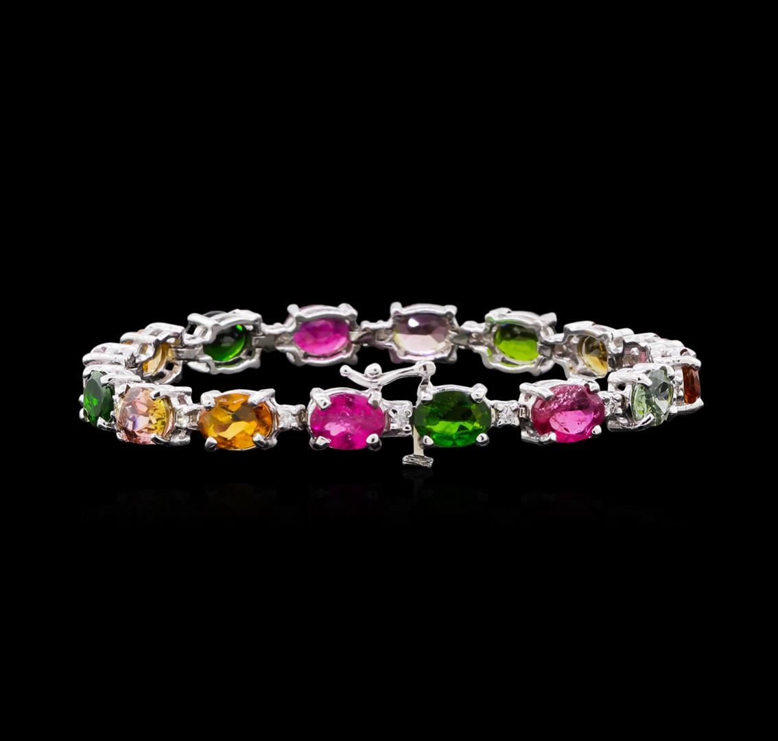 One electronically tested 14KT white gold lady's combination cast & assembled fashion straight line bracelet with a tongue clasp with foldover safety with a bright polish finish. The featured lady's bracelet measures 7 inches in length. Identified with markings of "14K". Condition is new, good workmanship. Containing: Sixteen prong set oval modified brilliant cut natural multi-color tourmalines, measuring 8.12 x 7.50 x 3.50mm, (depth est.) approximate total weight of 18.25ct., clarity is moderately included, cut is good. The featured lady's bracelet has a mix of tourmaline from green to orange to orangish yellow to very light pink to pink. Transmitting light somewhat diffusely, transparent to translucent. Colored gemstones are presumed to have been subjected to commonly used enhancement processes. Graded in the setting. Sixteen prong set round brilliant cut diamonds, measuring 2.00 - 1.95 x 1.19mm (depth est.) approximate total weight of 16 Stones = 0.45ct. Graded in the setting. Clarity: SI-1 to SI-2. Color: H - I. Cut Good. Total Weight of Colored Stones 18.25ct. Total Weight of Diamonds 0.45ct. Total Weight of Straight Line Bracelet 17.30gm. GAS Appraised at $4,895.00.
