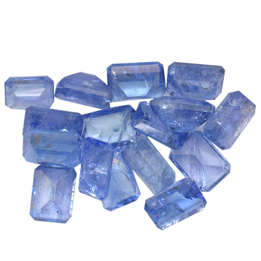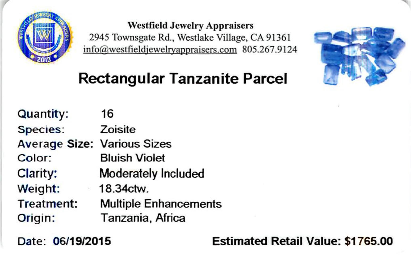 Sixteen rectangular step cut natural tanzanites exact total weight 18.34ct., clarity is moderately included, type I, medium dark, very slightly grayish, bluish violet color, (GIA bV 6/3), cut is good. Transmitting light with a minimum of distortion, transparent. Naturally occurring internal & external characteristics are present. Color grade is an average for the group. Tanzanite is a very rare gemstone that is only found in the country of Tanzania. Originally discovered in 1967. Tiffany & Company, named the stone Tanzanite. It is found in the Usumburu Mountains that border the Umba Valley of northern Tanzania. Tanzanite occurs in gray, brown, violet, blue, reddish-purple, & green. The gem is interesting because of its exceptional pleochroism. Rotated in different directions a tanzanite will exhibit multiple changes of color. Tanzanite has a low tolerance to ultrasonic cleaning, and should not be cleaned using this method. Westfield Appraised at $1,765.00.