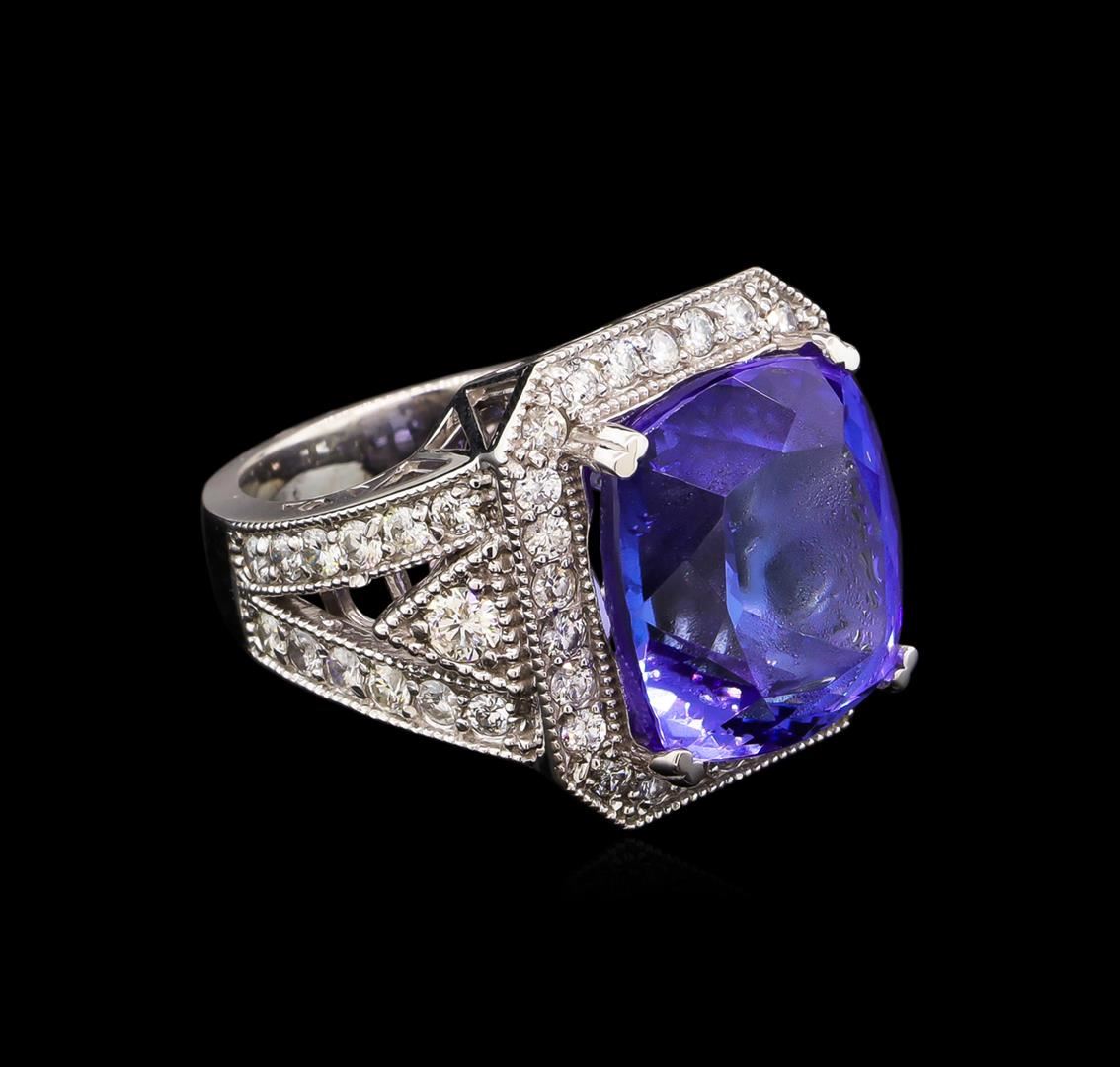 One electronically tested 14KT white gold lady's cast fashion ring with a tapered split shank with a bright polish with milgrain detailing finish. The featured lady's ring has a shank measuring 4.45 millimeters wide. Identified with markings of "K14". Condition is new, good workmanship. Containing: One prong set rectangular cushion modified brilliant cut natural tanzanite, measuring 15.45 x 14.30 x 10.15mm, 5%. bulge factor, approximate weight of 18.39ct., clarity is eye clean, type I, medium, moderately strong, violetish blue color, (GIA vB 5/4), cut is very good. Transmitting light with no distortion, transparent. Colored gemstones are presumed to have been subjected to commonly used enhancement processes. Graded in the setting. Two prong set round brilliant cut diamonds, measuring 3.15 - 3.05 x 1.86mm (depth est.) approximate total weight of 2 Stones = 0.22ct. Graded in the setting. Clarity: SI-2. Color: Good Twenty-Four prong set round brilliant cut diamonds, measuring 2.10 - 2.00 x 1.23mm (depth est.) approximate total weight of 24 Stones = 0.75ct. Graded in the setting. Clarity: SI-1 to I-1. Color: G - Good Twenty-Six prong set round brilliant cut diamonds, measuring 1.90 - 1.80 x 1.15mm (depth est.) approximate total weight of 26 Stones = 0.65ct. Graded in the setting. Clarity: SI-1 to I-1. Color: G - Good. Total Weight of Colored Stones 18.39ct. Total Weight of Diamonds 1.62ct. Total Weight of Ring 15.80gm. GAS Appraised at $36,505.00.