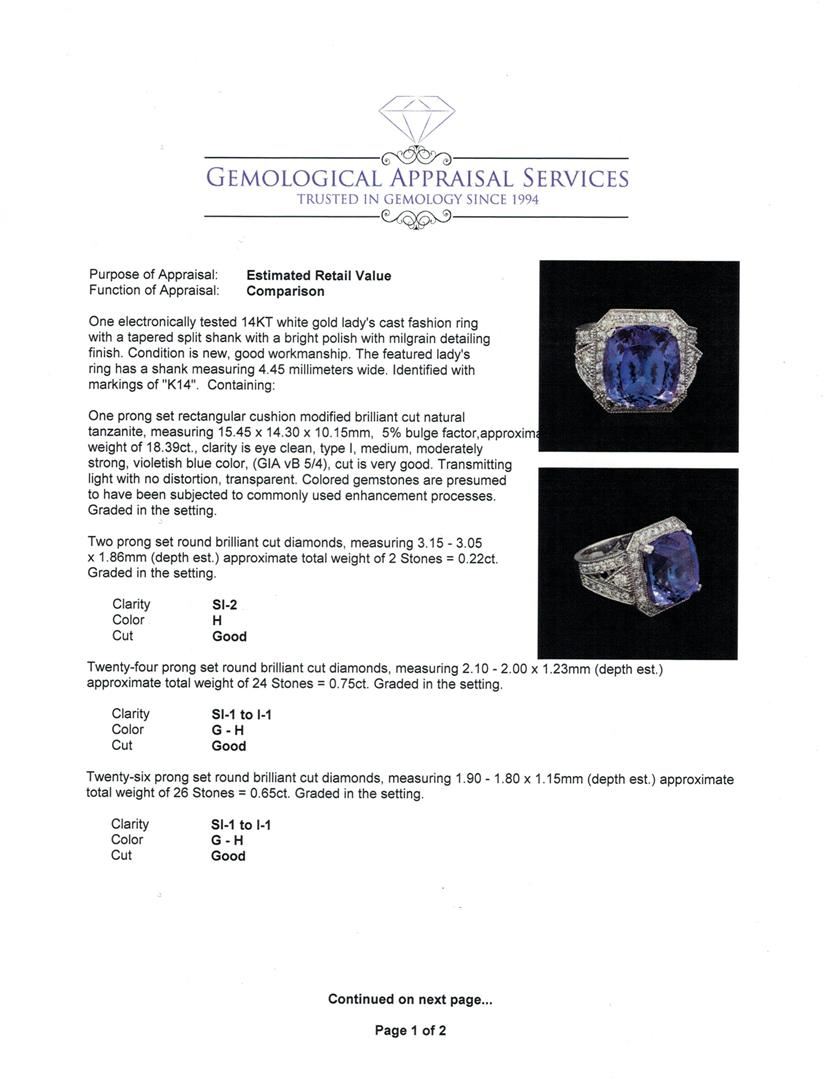 One electronically tested 14KT white gold lady's cast fashion ring with a tapered split shank with a bright polish with milgrain detailing finish. The featured lady's ring has a shank measuring 4.45 millimeters wide. Identified with markings of "K14". Condition is new, good workmanship. Containing: One prong set rectangular cushion modified brilliant cut natural tanzanite, measuring 15.45 x 14.30 x 10.15mm, 5%. bulge factor, approximate weight of 18.39ct., clarity is eye clean, type I, medium, moderately strong, violetish blue color, (GIA vB 5/4), cut is very good. Transmitting light with no distortion, transparent. Colored gemstones are presumed to have been subjected to commonly used enhancement processes. Graded in the setting. Two prong set round brilliant cut diamonds, measuring 3.15 - 3.05 x 1.86mm (depth est.) approximate total weight of 2 Stones = 0.22ct. Graded in the setting. Clarity: SI-2. Color: Good Twenty-Four prong set round brilliant cut diamonds, measuring 2.10 - 2.00 x 1.23mm (depth est.) approximate total weight of 24 Stones = 0.75ct. Graded in the setting. Clarity: SI-1 to I-1. Color: G - Good Twenty-Six prong set round brilliant cut diamonds, measuring 1.90 - 1.80 x 1.15mm (depth est.) approximate total weight of 26 Stones = 0.65ct. Graded in the setting. Clarity: SI-1 to I-1. Color: G - Good. Total Weight of Colored Stones 18.39ct. Total Weight of Diamonds 1.62ct. Total Weight of Ring 15.80gm. GAS Appraised at $36,505.00.