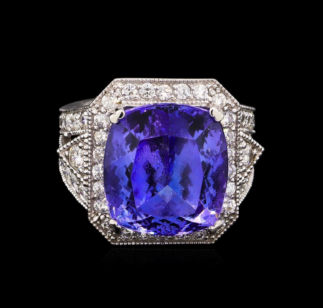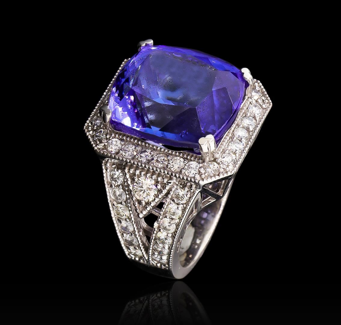 One electronically tested 14KT white gold lady's cast fashion ring with a tapered split shank with a bright polish with milgrain detailing finish. The featured lady's ring has a shank measuring 4.45 millimeters wide. Identified with markings of "K14". Condition is new, good workmanship. Containing: One prong set rectangular cushion modified brilliant cut natural tanzanite, measuring 15.45 x 14.30 x 10.15mm, 5%. bulge factor, approximate weight of 18.39ct., clarity is eye clean, type I, medium, moderately strong, violetish blue color, (GIA vB 5/4), cut is very good. Transmitting light with no distortion, transparent. Colored gemstones are presumed to have been subjected to commonly used enhancement processes. Graded in the setting. Two prong set round brilliant cut diamonds, measuring 3.15 - 3.05 x 1.86mm (depth est.) approximate total weight of 2 Stones = 0.22ct. Graded in the setting. Clarity: SI-2. Color: Good Twenty-Four prong set round brilliant cut diamonds, measuring 2.10 - 2.00 x 1.23mm (depth est.) approximate total weight of 24 Stones = 0.75ct. Graded in the setting. Clarity: SI-1 to I-1. Color: G - Good Twenty-Six prong set round brilliant cut diamonds, measuring 1.90 - 1.80 x 1.15mm (depth est.) approximate total weight of 26 Stones = 0.65ct. Graded in the setting. Clarity: SI-1 to I-1. Color: G - Good. Total Weight of Colored Stones 18.39ct. Total Weight of Diamonds 1.62ct. Total Weight of Ring 15.80gm.