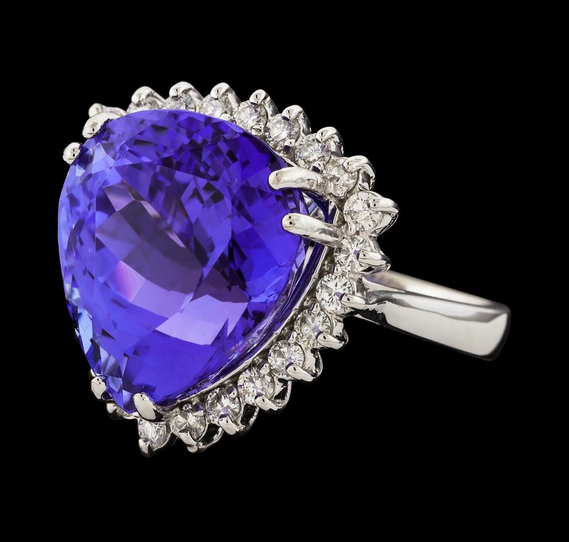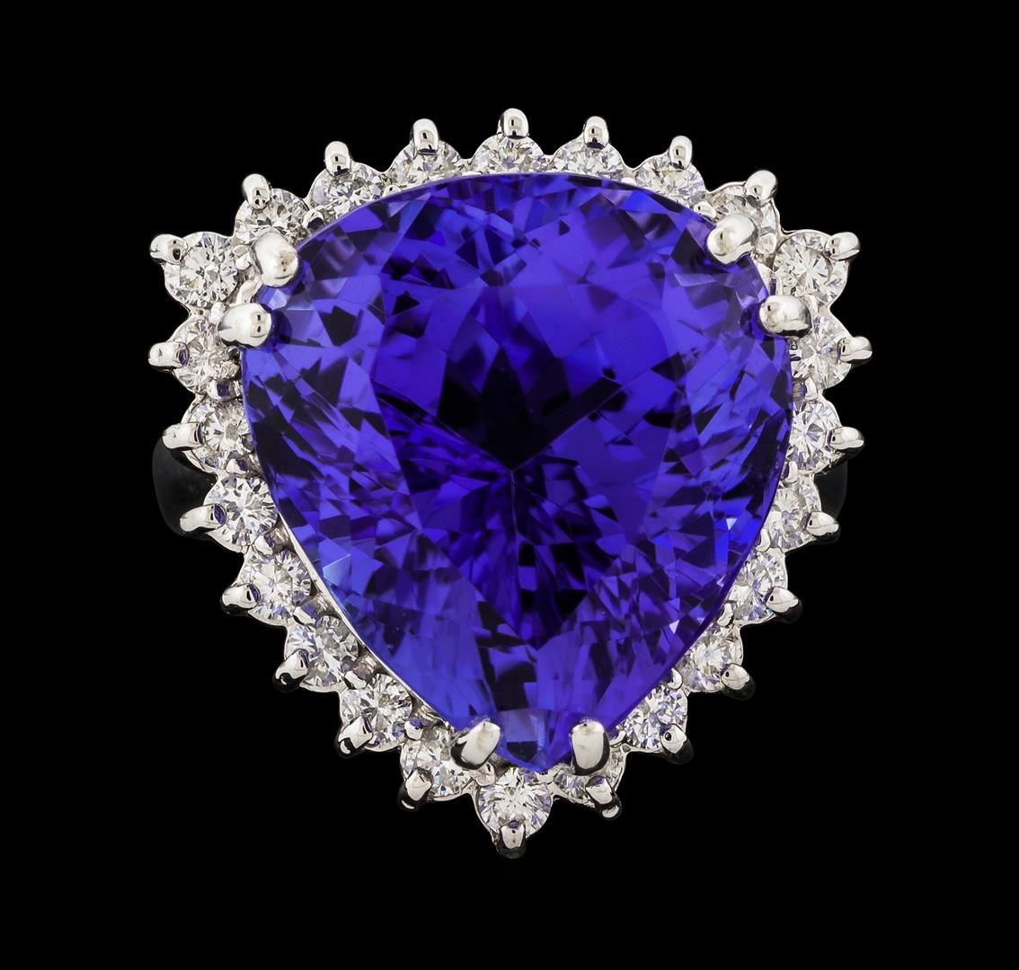 One electronically tested 14KT white gold lady's cast fashion ring with a basket halo with a bright polish finish. The featured lady's ring has a shank measuring 2.77 millimeters wide. Identified with markings of 'K14'. Condition is new, good workmanship. Containing: One prong set pear modified brilliant cut natural tanzanite, measuring 16.45 x 15.00 x 11.27mm, (depth est.) approximate weight of 18.40ct., clarity is eye clean, medium dark, moderately strong, violetish blue color, (GIA vB 6/4), cut is very good. Transmitting light with no distortion, transparent. Colored gemstones are presumed to have been subjected to commonly used enhancement processes. Graded in the setting. Twenty-Four prong set round brilliant cut diamonds, measuring 2.10 - 2.00 x 1.23mm (depth est.) approximate total weight of 24 Stones = 0.75ct. Graded in the setting. Clarity SI-1 to SI-2. Color: G - I Cut Good. Total Weight of Colored Stones 18.40ct.. Total Weight of Diamonds 0.75ct.. Total Weight of Ring 10.20gm. GAS Appraised at $31,430.00.