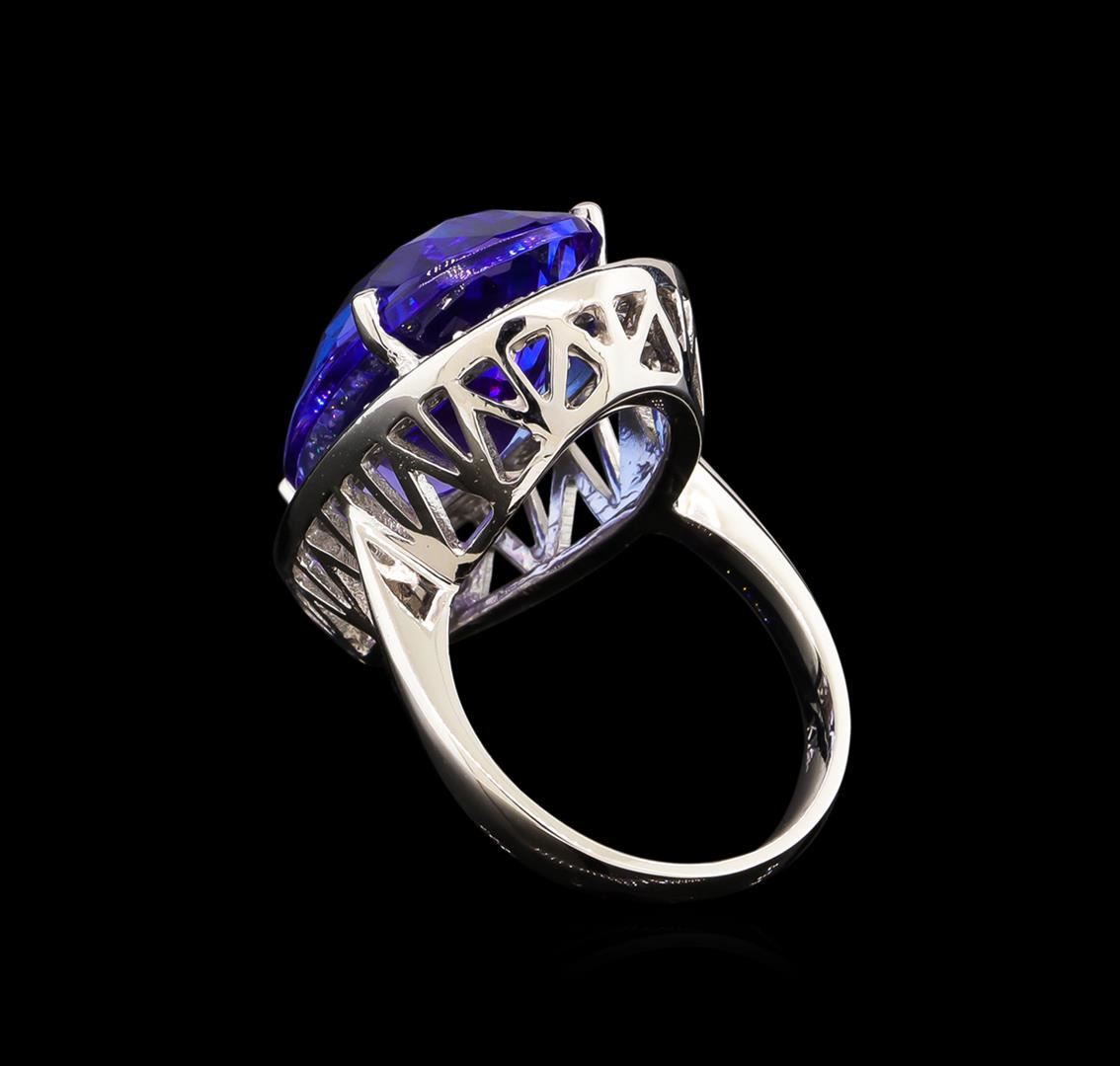 One electronically tested 14KT white gold lady's cast fashion ring with a basket halo with a bright polish finish. The featured lady's ring has a shank measuring 3.28 millimeters wide. Identified with markings of "K14". Condition is new, good workmanship. Containing: One prong set pear modified brilliant cut natural tanzanite, measuring 22.95 x 13.76 x 8.33mm, 4%. bulge factor, approximate weight of 18.42ct., clarity is eye clean, type I, medium, moderately strong, violetish blue color, (GIA vB 5/4), cut is excellent. Transmitting light with no distortion, transparent. Colored gemstones are presumed to have been subjected to commonly used enhancement processes. Graded in the setting. Thirty-Five prong set round brilliant cut diamonds, measuring 1.60 - 1.50 x 0.96mm (depth est.) approximate total weight of 35 Stones = 0.51ct. Graded in the setting. Clarity: VS-2 to SI-1. Color: H - I. Cut Good. Total Weight of Colored Stones 18.42ct. Total Weight of Diamonds 0.51ct. Total Weight of Ring 12.40gm. GAS Appraised at $34,730.00.
