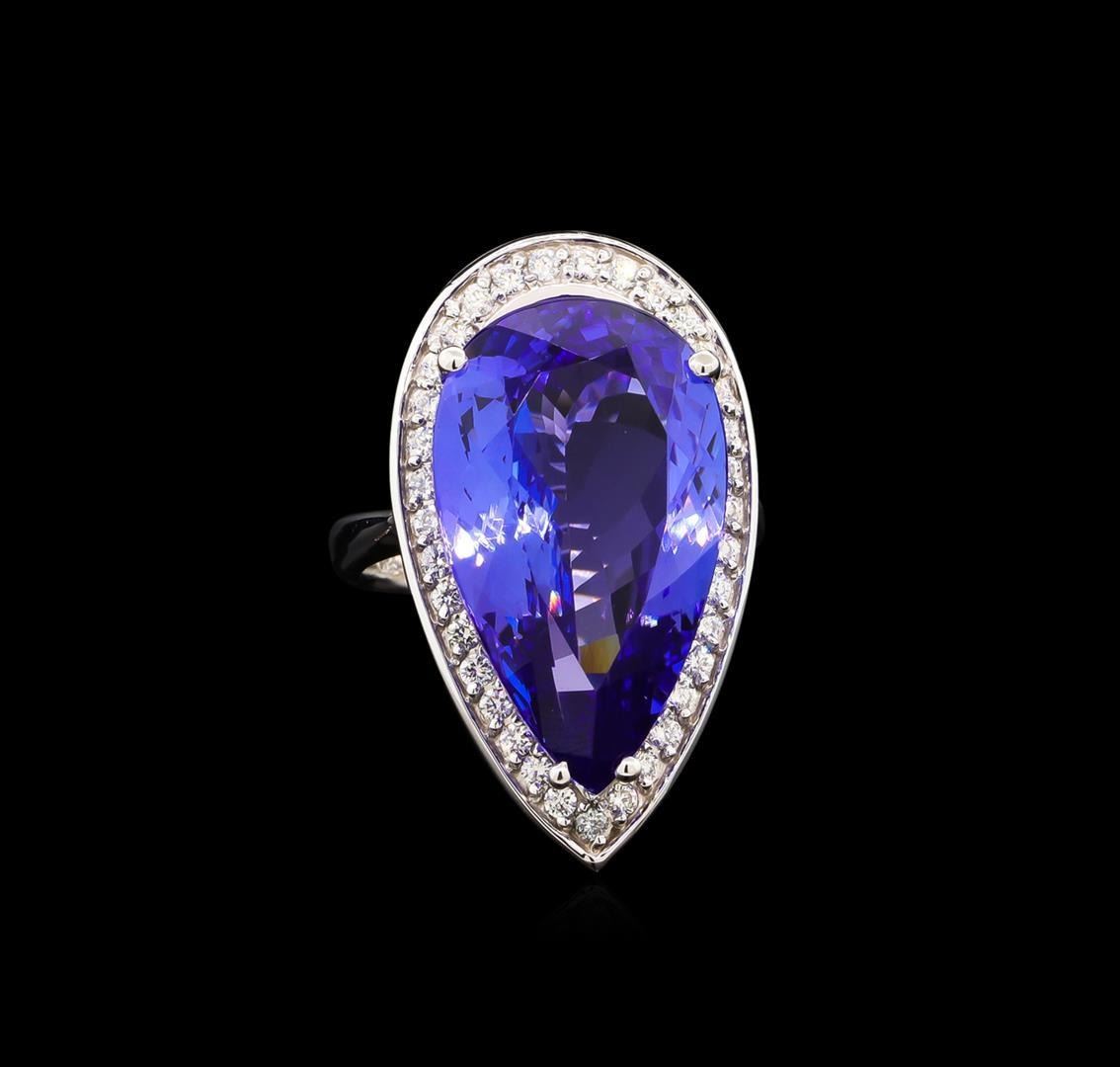 One electronically tested 14KT white gold lady's cast fashion ring with a basket halo with a bright polish finish. The featured lady's ring has a shank measuring 3.28 millimeters wide. Identified with markings of "K14". Condition is new, good workmanship. Containing: One prong set pear modified brilliant cut natural tanzanite, measuring 22.95 x 13.76 x 8.33mm, 4%. bulge factor, approximate weight of 18.42ct., clarity is eye clean, type I, medium, moderately strong, violetish blue color, (GIA vB 5/4), cut is excellent. Transmitting light with no distortion, transparent. Colored gemstones are presumed to have been subjected to commonly used enhancement processes. Graded in the setting. Thirty-Five prong set round brilliant cut diamonds, measuring 1.60 - 1.50 x 0.96mm (depth est.) approximate total weight of 35 Stones = 0.51ct. Graded in the setting. Clarity: VS-2 to SI-1. Color: H - I. Cut Good. Total Weight of Colored Stones 18.42ct. Total Weight of Diamonds 0.51ct. Total Weight of Ring 12.40gm. GAS Appraised.