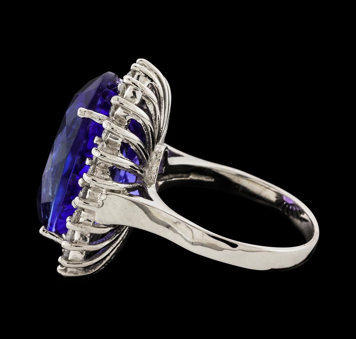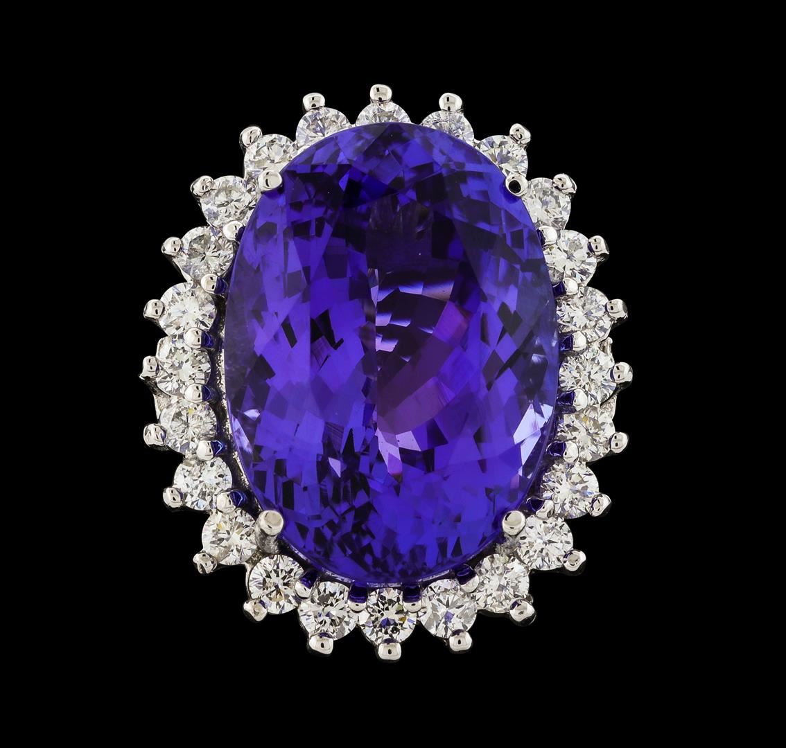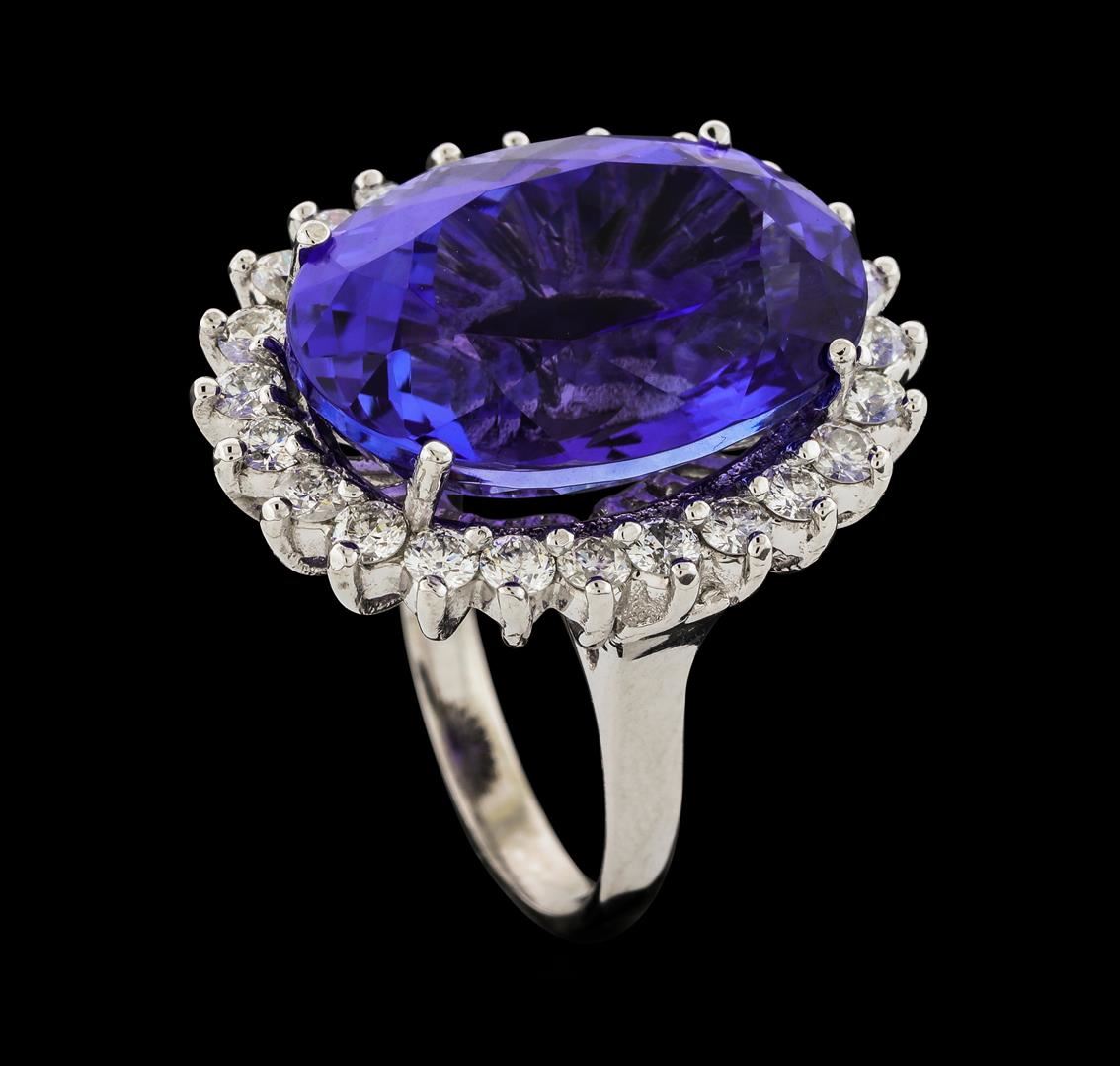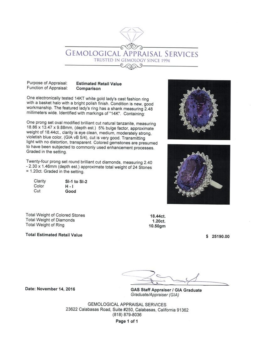 One electronically tested 14KT white gold lady's cast fashion ring with a basket halo with a bright polish finish. The featured lady's ring has a shank measuring 2.48 millimeters wide. Identified with markings of '14K'. Condition is new, good workmanship. Containing: One prong set oval modified brilliant cut natural tanzanite, measuring 18.86 x 13.47 x 9.88mm, (depth est.) 5%. bulge factor, approximate weight of 18.44ct., clarity is eye clean, medium, moderately strong, violetish blue color, (GIA vB 5/4), cut is very good. Transmitting light with no distortion, transparent. Colored gemstones are presumed to have been subjected to commonly used enhancement processes. Graded in the setting. Twenty-Four prong set round brilliant cut diamonds, measuring 2.40 - 2.30 x 1.46mm (depth est.) approximate total weight of 24 Stones = 1.20ct. Graded in the setting. Clarity SI-1 to SI-2. Color: H - I Cut Good. Total Weight of Colored Stones 18.44ct.. Total Weight of Diamonds 1.20ct.. Total Weight of Ring 10.50gm GAS Appraised at $25,190.00.