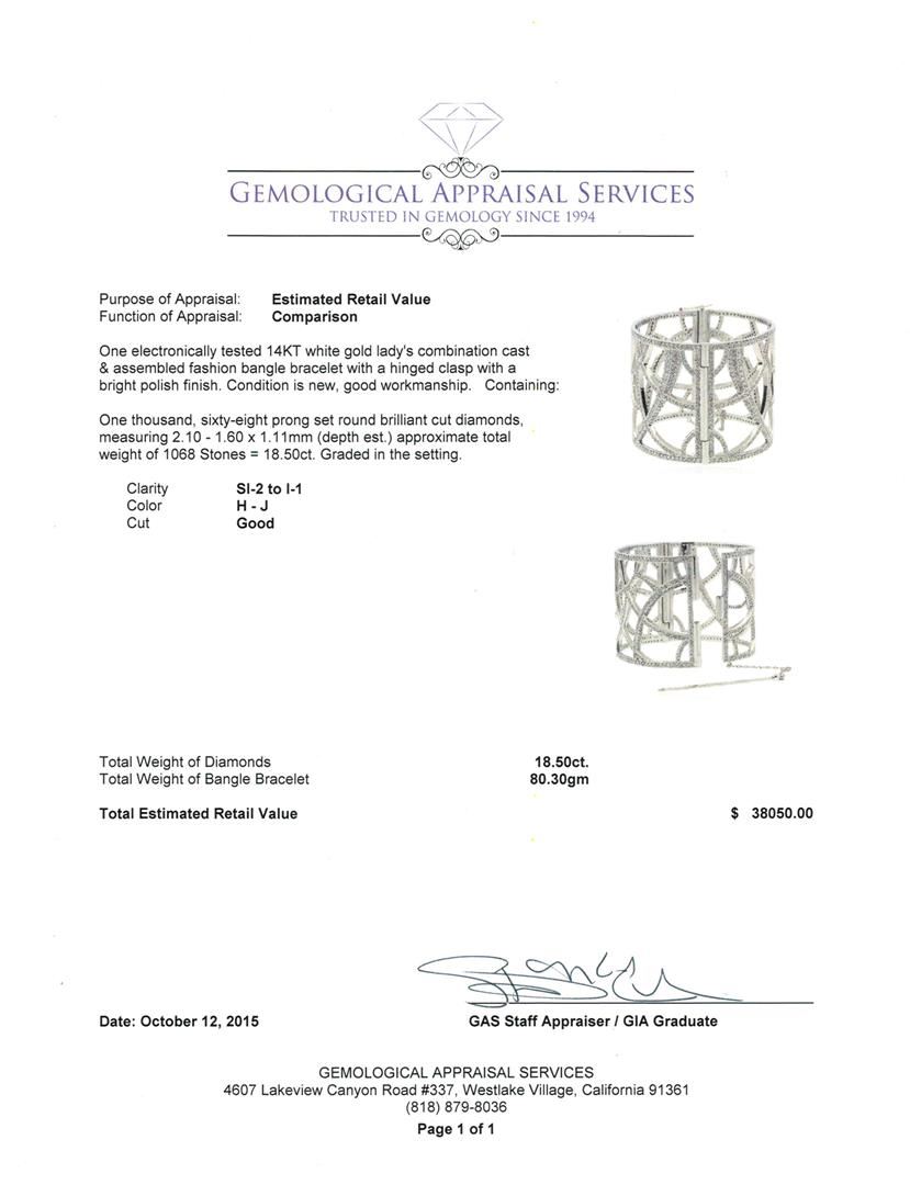 One electronically tested 14KT white gold lady's combination cast & assembled fashion bangle bracelet with a hinged clasp with a bright polish finish. Condition is new, good workmanship. Containing: One Thousand, Sixty-Eight prong set round brilliant cut diamonds, measuring 2.10 - 1.60 x 1.11mm (depth est.) approximate total weight of 1068 Stones = 18.50ct. Graded in the setting. Clarity: SI-2 to I-1. Color: H - Good. Total Weight of Diamonds 18.50ct. Total Weight of Bangle Bracelet 80.30gm. GAS Appraised at $38,050.00.