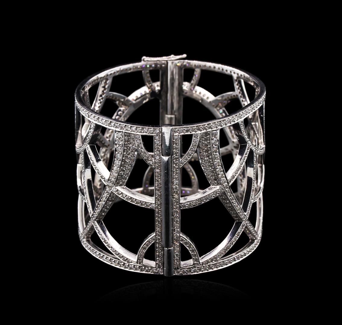 One electronically tested 14KT white gold lady's combination cast & assembled fashion bangle bracelet with a hinged clasp with a bright polish finish. Condition is new, good workmanship. Containing: One Thousand, Sixty-Eight prong set round brilliant cut diamonds, measuring 2.10 - 1.60 x 1.11mm (depth est.) approximate total weight of 1068 Stones = 18.50ct. Graded in the setting. Clarity: SI-2 to I-1. Color: H - Good. Total Weight of Diamonds 18.50ct. Total Weight of Bangle Bracelet 80.30gm. GAS Appraised at $38,050.00.