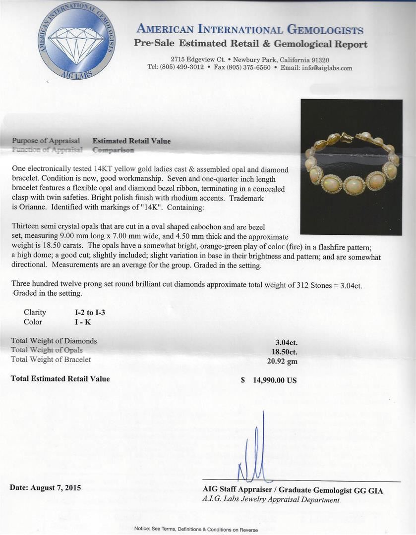 One electronically tested 14KT yellow gold ladies cast & assembled opal and diamond bracelet. Seven and one-quarter inch length bracelet features a flexible opal and diamond bezel ribbon, terminating in a concealed clasp with twin safeties. Bright polish finish with rhodium accents. Trademark is Orianne. Identified with markings of "14K". Condition is new, good workmanship. Containing: Thirteen semi crystal opals that are cut in a oval shaped cabochon and are bezel set, measuring 9.00 mm long x 7.00 mm wide, and 4.50 mm thick and the approximate weight is 18.50 carats. The opals have a somewhat bright, orange-green play of color (fire) in a flashfire pattern; a high dome; a good cut; slightly included; slight variation in base in their brightness and pattern; and are somewhat directional. Measurements are an average for the group. Graded in the setting. Three Hundred Twelve prong set round brilliant cut diamonds approximate total weight of 312 Stones = 3.04ct. Graded in the setting. Clarity: I-2 to I-3. Color: I - K. Total Weight of Diamonds 3.04ct. Total Weight of Opals 18.50ct. Total Weight of Bracelet 20.92gm. AIG Appraised at $14,990.00.