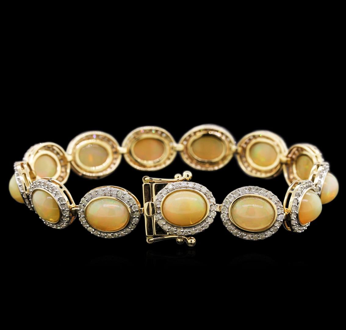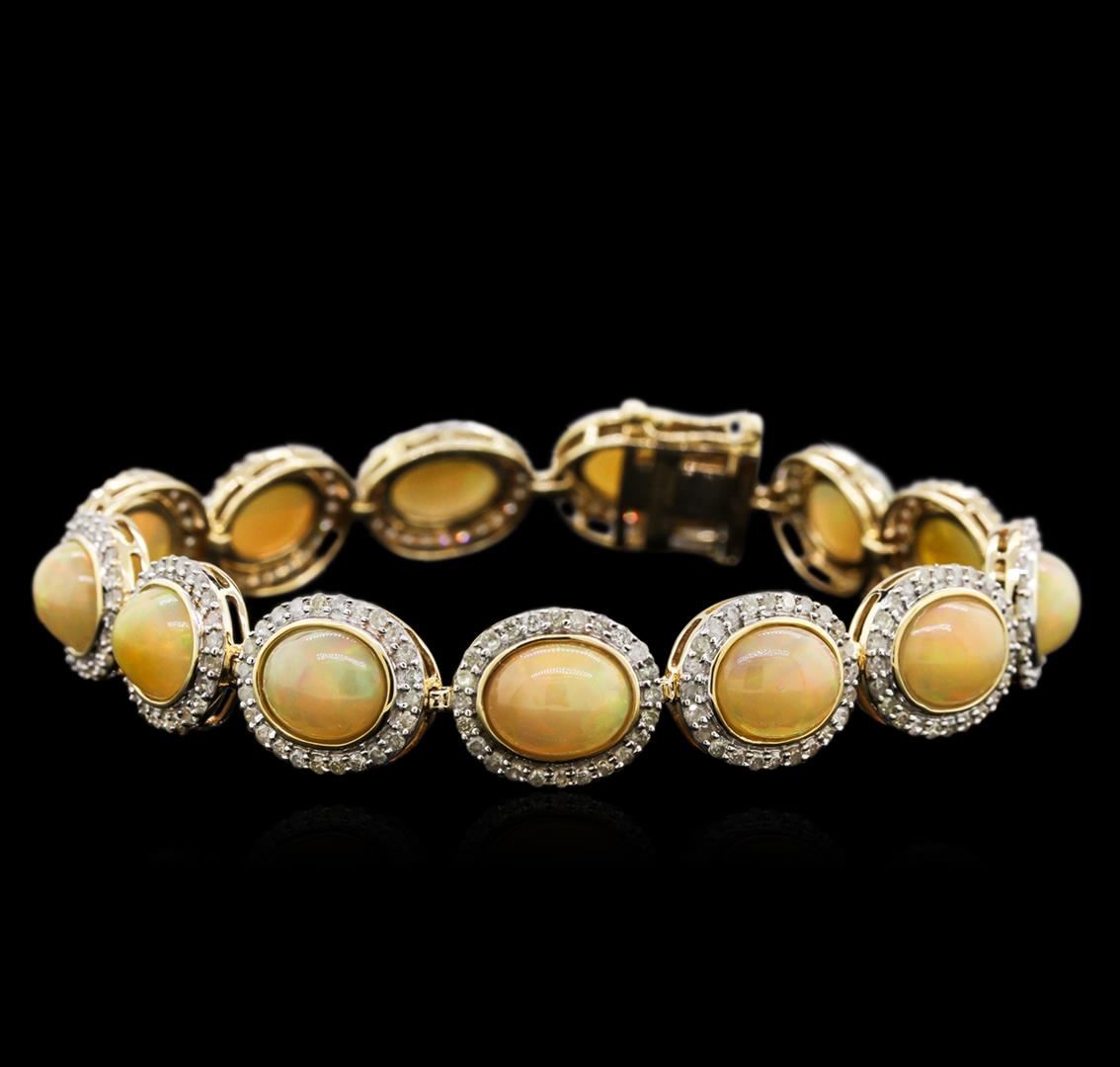 One electronically tested 14KT yellow gold ladies cast & assembled opal and diamond bracelet. Seven and one-quarter inch length bracelet features a flexible opal and diamond bezel ribbon, terminating in a concealed clasp with twin safeties. Bright polish finish with rhodium accents. Trademark is Orianne. Identified with markings of "14K". Condition is new, good workmanship. Containing: Thirteen semi crystal opals that are cut in a oval shaped cabochon and are bezel set, measuring 9.00 mm long x 7.00 mm wide, and 4.50 mm thick and the approximate weight is 18.50 carats. The opals have a somewhat bright, orange-green play of color (fire) in a flashfire pattern; a high dome; a good cut; slightly included; slight variation in base in their brightness and pattern; and are somewhat directional. Measurements are an average for the group. Graded in the setting. Three Hundred Twelve prong set round brilliant cut diamonds approximate total weight of 312 Stones = 3.04ct. Graded in the setting. Clarity: I-2 to I-3. Color: I - K. Total Weight of Diamonds 3.04ct. Total Weight of Opals 18.50ct. Total Weight of Bracelet 20.92gm. AIG Appraised at $14,990.00.