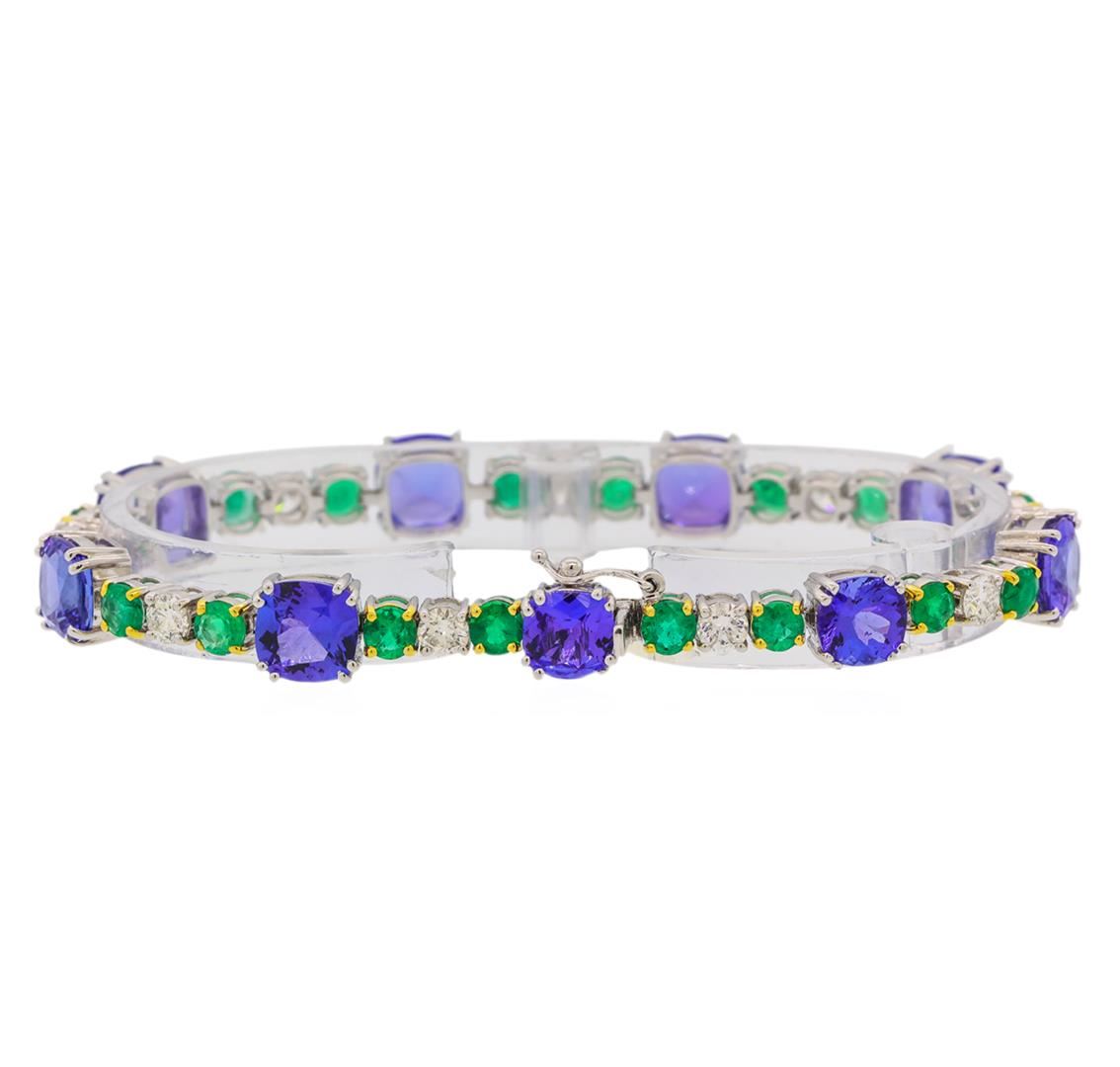 One electronically tested 18KT white and yellow gold lady's combination cast & assembled fashion bracelet with a tongue clasp with foldover safety with a bright polish finish. The featured lady's bracelet measures approximately 7.5 inches in length. Identified with markings of '18K'. Condition is new, good workmanship. Containing: Two prong set square cushion modified brilliant cut natural tanzanites, measuring 7.02 x 6.88 x 4.52mm, (depth est.) approximate total weight of 3.44ct., clarity is eye clean, medium dark, moderately strong, violetish blue color, (GIA vB 6/4), cut is good. Transmitting light with no distortion, transparent. Colored gemstones are presumed to have been subjected to commonly used enhancement processes. Graded in the setting. Seven prong set square cushion modified brilliant cut natural tanzanites, measuring 7.55 x 7.45 x 4.87mm, (depth est.) approximate total weight of 15.07ct., clarity is eye clean, medium dark, moderately strong, violetish blue color, (GIA vB 6/4), cut is good. Transmitting light with no distortion, transparent. Colored gemstones are presumed to have been subjected to commonly used enhancement processes. Graded in the setting. Eighteen prong set round modified brilliant cut natural emeralds, measuring 4.75 - 4.10 x 2.88 mm, (depth est.) approximate total weight of 6.30ct., clarity is moderately included, medium, moderately strong, green color, (GIA G 5/4), cut is good. Transmitting light somewhat diffusely, transparent to translucent. Naturally occurring internal & external characteristics are present. Indications of oil residue. Colored gemstones are presumed to have been subjected to commonly used enhancement processes. Graded in the setting. Nine prong set round brilliant cut diamonds, measuring 4.10 - 3.95 x 2.54mm (depth est.) approximate total weight of 9 Stones = 2.26ct. Graded in the setting. Clarity VS-2 to SI-1. Color: G - H Cut Good. Total Weight of Colored Stones 24.81ct.. Total Weight of Diamonds 2.26ct.. Total Weight of Bracelet 24.00gm. GAS Appraised at $39,000.00.