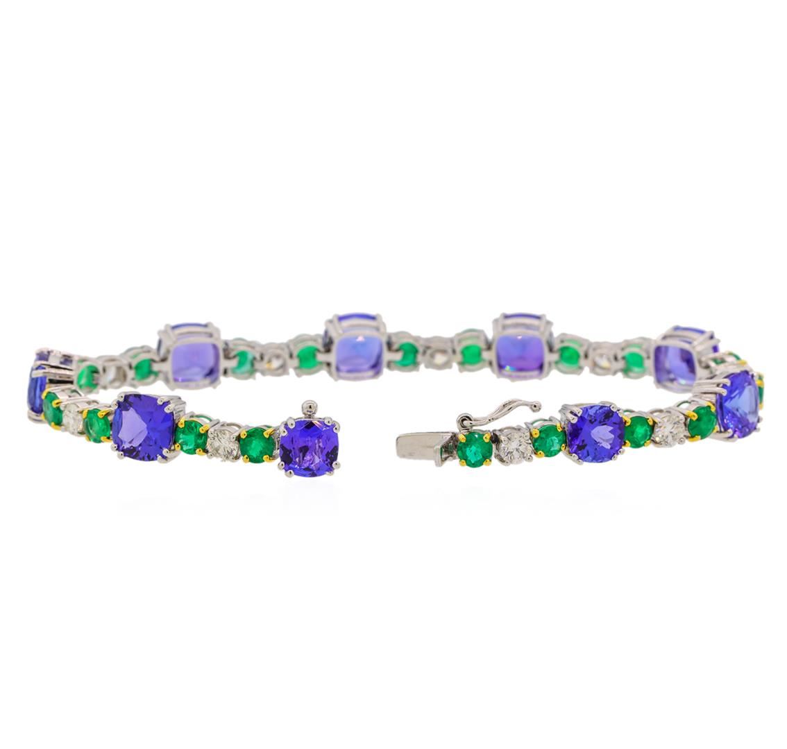 One electronically tested 18KT white and yellow gold lady's combination cast & assembled fashion bracelet with a tongue clasp with foldover safety with a bright polish finish. The featured lady's bracelet measures approximately 7.5 inches in length. Identified with markings of '18K'. Condition is new, good workmanship. Containing: Two prong set square cushion modified brilliant cut natural tanzanites, measuring 7.02 x 6.88 x 4.52mm, (depth est.) approximate total weight of 3.44ct., clarity is eye clean, medium dark, moderately strong, violetish blue color, (GIA vB 6/4), cut is good. Transmitting light with no distortion, transparent. Colored gemstones are presumed to have been subjected to commonly used enhancement processes. Graded in the setting. Seven prong set square cushion modified brilliant cut natural tanzanites, measuring 7.55 x 7.45 x 4.87mm, (depth est.) approximate total weight of 15.07ct., clarity is eye clean, medium dark, moderately strong, violetish blue color, (GIA vB 6/4), cut is good. Transmitting light with no distortion, transparent. Colored gemstones are presumed to have been subjected to commonly used enhancement processes. Graded in the setting. Eighteen prong set round modified brilliant cut natural emeralds, measuring 4.75 - 4.10 x 2.88 mm, (depth est.) approximate total weight of 6.30ct., clarity is moderately included, medium, moderately strong, green color, (GIA G 5/4), cut is good. Transmitting light somewhat diffusely, transparent to translucent. Naturally occurring internal & external characteristics are present. Indications of oil residue. Colored gemstones are presumed to have been subjected to commonly used enhancement processes. Graded in the setting. Nine prong set round brilliant cut diamonds, measuring 4.10 - 3.95 x 2.54mm (depth est.) approximate total weight of 9 Stones = 2.26ct. Graded in the setting. Clarity VS-2 to SI-1. Color: G - H Cut Good. Total Weight of Colored Stones 24.81ct.. Total Weight of Diamonds 2.26ct.. Total Weight of Bracelet 24.00gm. GAS Appraised at $39,000.00.
