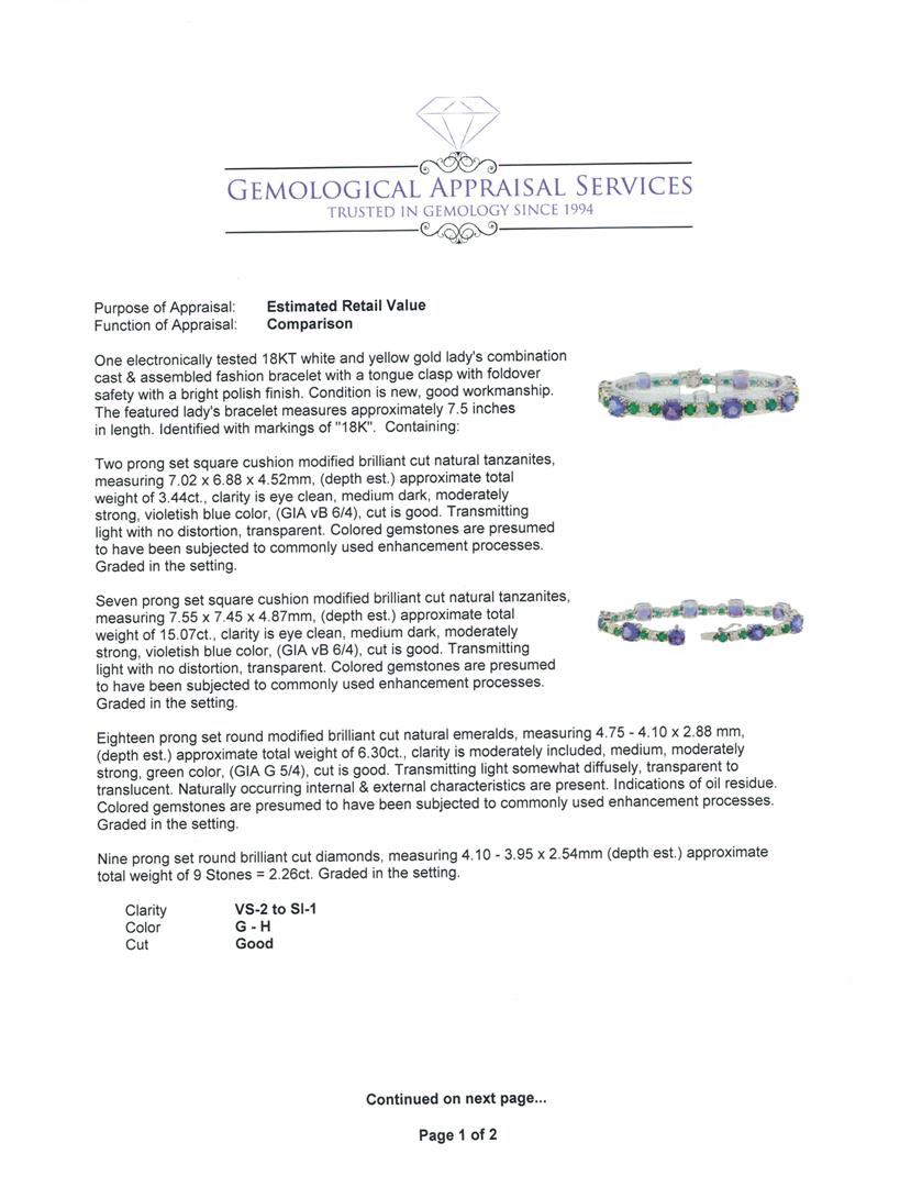 One electronically tested 18KT white and yellow gold lady's combination cast & assembled fashion bracelet with a tongue clasp with foldover safety with a bright polish finish. The featured lady's bracelet measures approximately 7.5 inches in length. Identified with markings of '18K'. Condition is new, good workmanship. Containing: Two prong set square cushion modified brilliant cut natural tanzanites, measuring 7.02 x 6.88 x 4.52mm, (depth est.) approximate total weight of 3.44ct., clarity is eye clean, medium dark, moderately strong, violetish blue color, (GIA vB 6/4), cut is good. Transmitting light with no distortion, transparent. Colored gemstones are presumed to have been subjected to commonly used enhancement processes. Graded in the setting. Seven prong set square cushion modified brilliant cut natural tanzanites, measuring 7.55 x 7.45 x 4.87mm, (depth est.) approximate total weight of 15.07ct., clarity is eye clean, medium dark, moderately strong, violetish blue color, (GIA vB 6/4), cut is good. Transmitting light with no distortion, transparent. Colored gemstones are presumed to have been subjected to commonly used enhancement processes. Graded in the setting. Eighteen prong set round modified brilliant cut natural emeralds, measuring 4.75 - 4.10 x 2.88 mm, (depth est.) approximate total weight of 6.30ct., clarity is moderately included, medium, moderately strong, green color, (GIA G 5/4), cut is good. Transmitting light somewhat diffusely, transparent to translucent. Naturally occurring internal & external characteristics are present. Indications of oil residue. Colored gemstones are presumed to have been subjected to commonly used enhancement processes. Graded in the setting. Nine prong set round brilliant cut diamonds, measuring 4.10 - 3.95 x 2.54mm (depth est.) approximate total weight of 9 Stones = 2.26ct. Graded in the setting. Clarity VS-2 to SI-1. Color: G - H Cut Good. Total Weight of Colored Stones 24.81ct.. Total Weight of Diamonds 2.26ct.. Total Weight of Bracelet 24.00gm. GAS Appraised at $39,000.00.