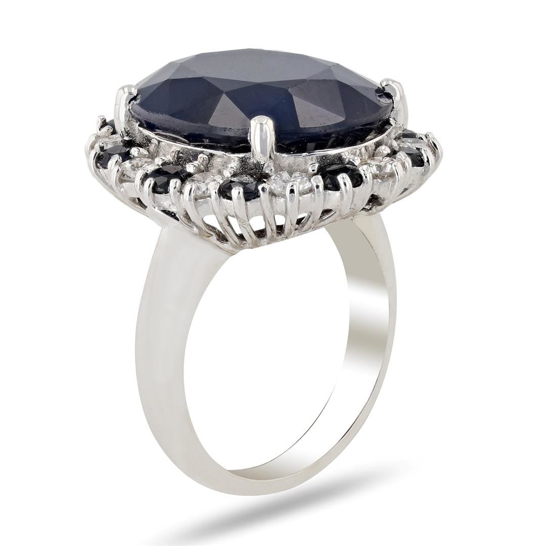 14K Gold Sapphire & Diamond Ring One polished, stamped, and tested 14K white gold ring with a bright finish. The ring is mounted with: 11 faceted sapphires weighing approximately 18.60 carats, and 10 genuine round diamonds weighing approximately 0.83 carats. This item weighs 9.8 grams, condition is new, excellent workmanship. MAIN GEMSTONES Species: Natural Corundum Variety: Sapphire Shape: Round / Oval Cutting Style: Brilliant Cut Crown Step Cut Pavilion Quantity: 11 Sapphires Measurements: 17.3 x 14.4 x 8.1 mm (1 oval) 2.8 - 3.0 mm (10 round) Total Weight: 18.60 carats Color: Dark Blue Cut Grade: Good - Very Good Refractive Index: 1.762 - 1.770 DR Birefringence: 0.008 - 0.010 Hardness: 9 ADJACENT GEMSTONES ON RING Identity: Natural Diamond Shape: Round Cutting Style: Brilliant Cut Quantity: 10 Diamonds Measurements: 2.7 - 2.9 mm Total Weight: 0.83 carats Clarity Grade: SI2 Color Grade: H - I Refractive Index: 2.418 Hardness: 10 TOTAL SAPPHIRE WEIGHT: 18.60 ctw TOTAL DIAMOND WEIGHT: 0.83ctw WEIGHT OF ITEM: 9.8 grams GOLD CONTENT: 14K White Gold