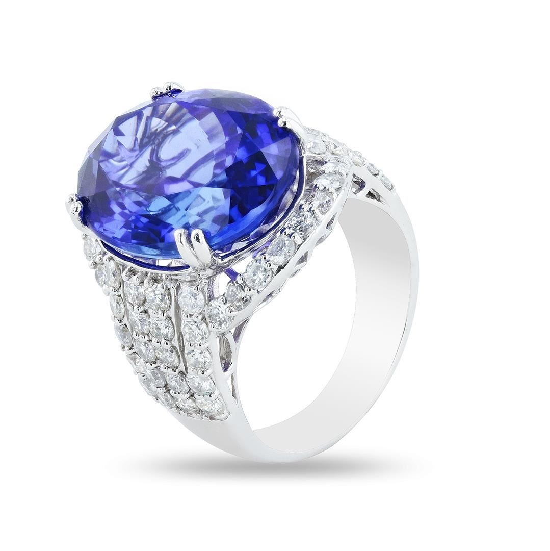 Platinum (PLAT) natural tanzanite zoisite and diamond ring. An oval modified brilliant cut natural tanzanite zoisite gemstone is mounted in the center of the ring. Round brilliant cut diamonds accent the ring around the cenier gemstone. The ring hia a gro