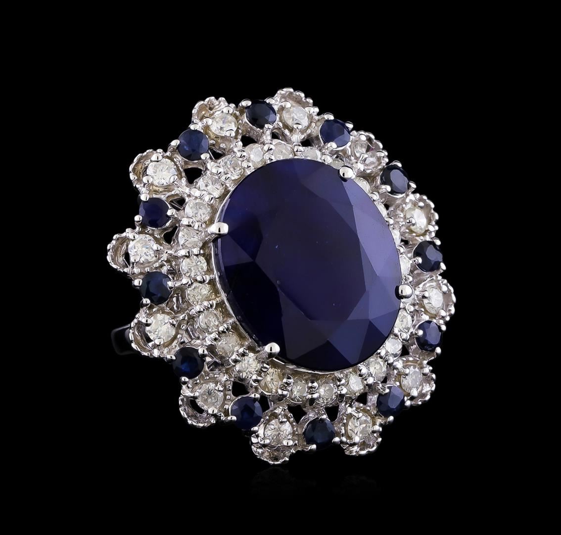 14K Gold Sapphire & Diamond Ring. One Polished, stamped, and tested 14K white gold ring mounted with: 13 faceted sapphires weighing approximately 18.73 carats, and 37 faceted round diamonds, weighing approximately 1.34 carats. This item weighs 13.3 grams, condition is new, very good workmanship. Main Gemstones: Species: Natural Corundum. Variety: Sapphire. Shape: Oval/round. Quantity: 13 Sapphires. Measurements: 16.9 x 14.4 mm ( 1 oval ). 2.2 mm ( 12 round ). 18.73 carats. Color: Dark blue. Cut grade: Very Good. Treatment: Fracture filled. Refractive index: 1.762-1.770 DR. Birefringence: 0.008-0.010. Hardness: 9. Adjacent gemstones on Ring: Identity: Natural diamond. Shape: Round. Cutting style: Brilliant cut. Quantity: 37 Diamonds. Measurements: 1.8-3.0 mm. Total weight: 1.34 carats. Clarity grade: SI1-I1. Color grade: H-J. Refractive index: 2.418. Hardness: 10. Gold content: 14K white gold. AIGL Appraised at $9,422.00.