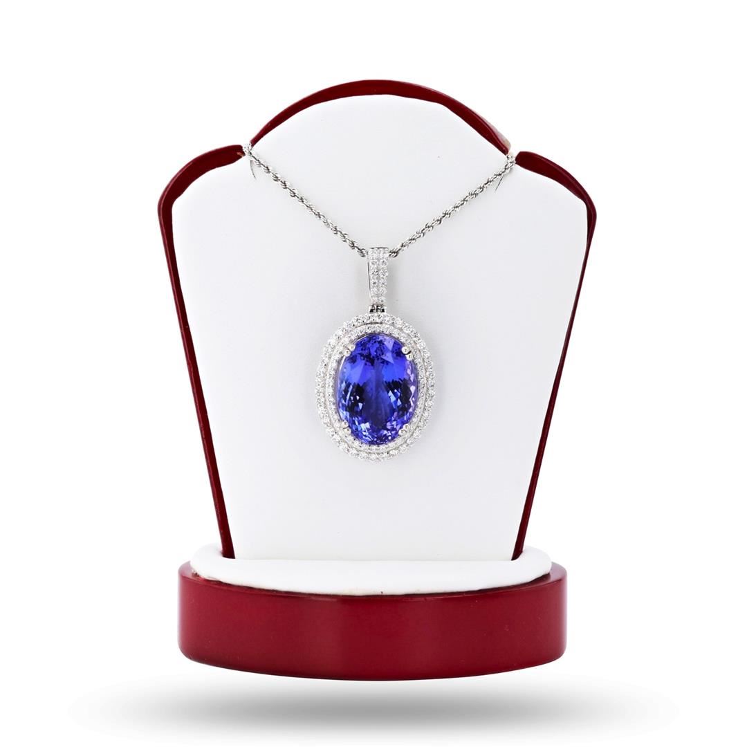 18.75ct Tanzanite and 1.39ctw Diamond Platinum Pendant/Necklace (GIA CERTIFIED). One electronically tested platinum ladies cast & assembled tanzanite and diamond pendant with chain. Condition is new, good workmanship. The pendant features a tanzanite set within a diamond bezel completed by a diamond set bail. The pendant is supported by an eighteen inch length platinum designer style chain, terminating in a lobster claw clasp. Bright polish finish. Trademark is Orianne. Identified with markings of "PT950". Containing: One prong set oval modified brilliant cut natural tanzanite, measuring 19.86 x 14.07 x 9.11mm, exact weight 18.75ct., clarity is eye clean, type I, medium dark, very slightly grayish, violet color, (GIA V 6/3), cut is good. Transmitting light with no distortion, transparent. GIA Gemological Report attached. Graded loose prior to setting in the GIA Laboratory, Report 2173388266. Tanzanite is a very rare gemstone that is only found in the country of Tanzania. Originally discovered in 1967. Tiffany & Company, named the stone Tanzanite. It is found in the Usumburu Mountains that border the Umba Valley of northern Tanzania. Tanzanite occurs in gray, brown, violet, blue, reddish-purple, & green. The gem is interesting because of its exceptional pleochroism. Rotated in different directions a tanzanite will exhibit multiple changes of color. Tanzanite has a low tolerance to ultrasonic cleaning, and should not be cleaned using this method. Eighty-eight prong set round brilliant cut diamonds approximate total weight of 88 Stones = 1.39ctw. Graded in the setting. Clarity SI1 to I1 Color F - H Total Weight of Colored Stones 18.75ct. Total Weight of Diamonds 1.39ctw. Total Weight of Pendant With Chain 19.99 gm NATURAL TANZANITE AAA+ QUALITY G.I.A. CERTIFIED SET IN PLATINUM