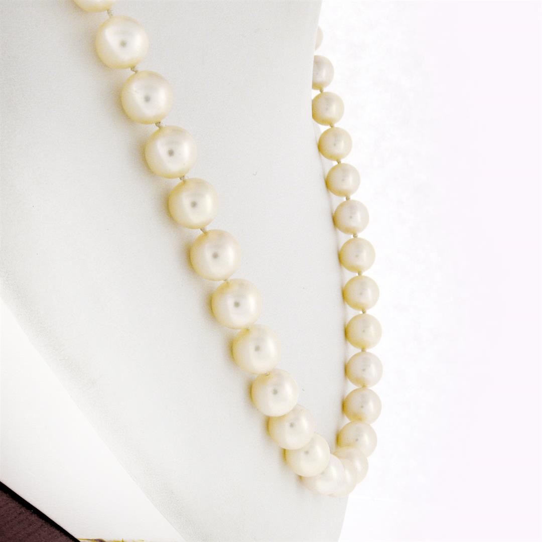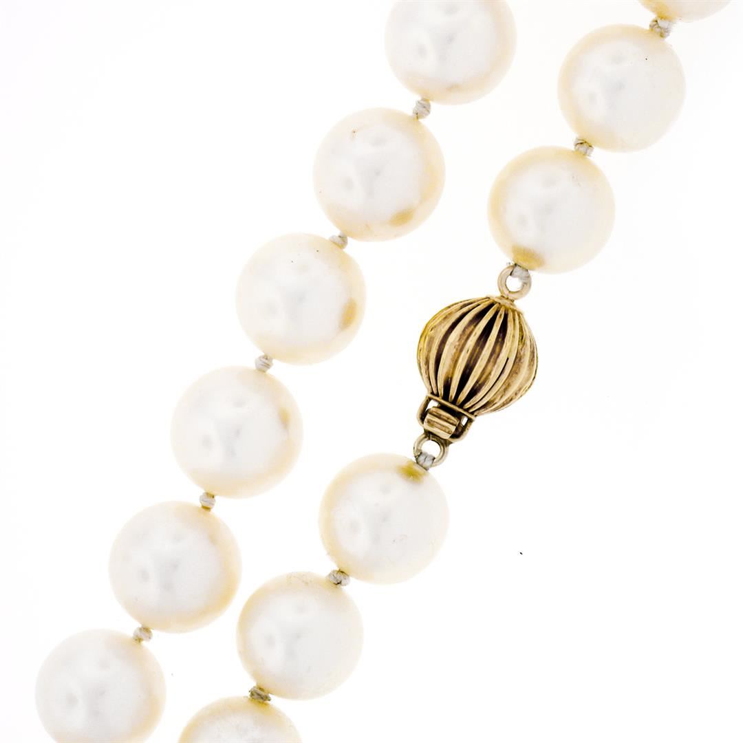 An estate bead necklace with 14k yellow gold clasp, featuring 47 round shape cultured akoya pearls (8.5 - 8.75mm). 18 inch bead link chain, 44.36 grams total weight, clasp measures 8.0mm.