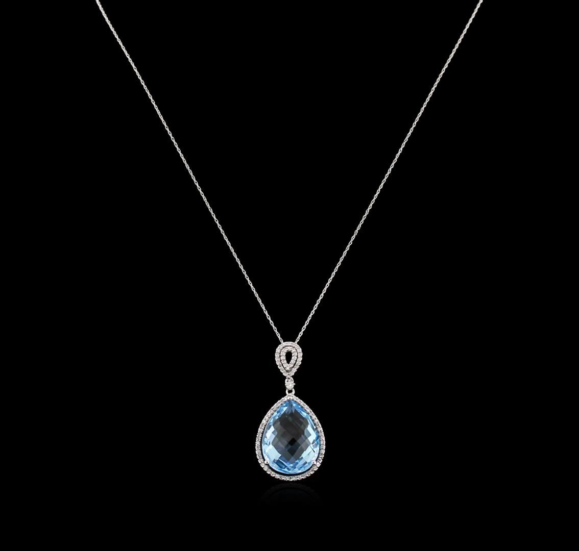 One pendant with chain featuring: 14KT white gold weighing 8.90 grams containing one blue topaz center stone with a total weight of 18.80ct and diamonds with a total weight of 0.42ct.