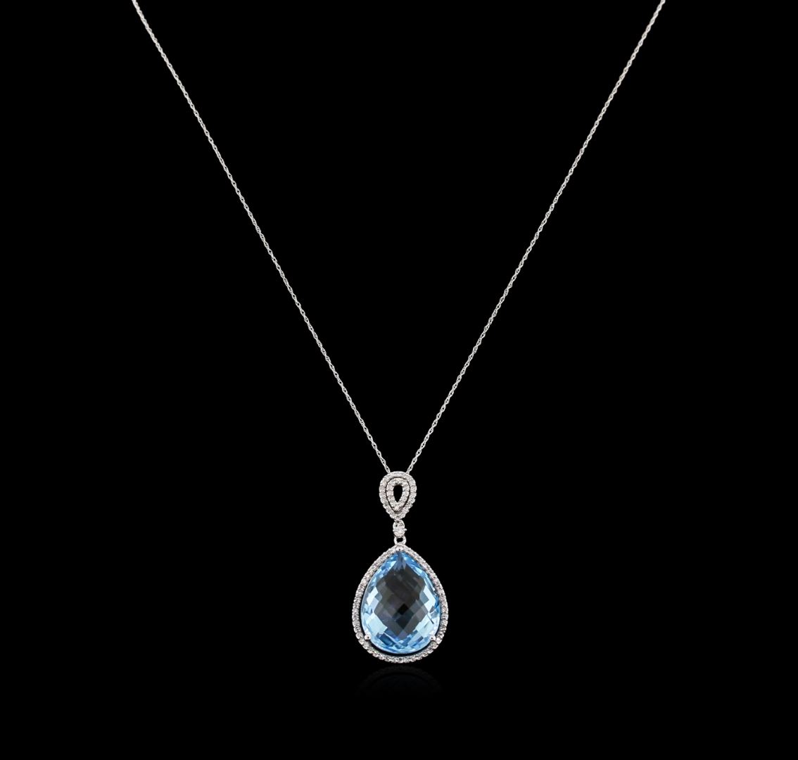 One pendant with chain featuring: 14KT white gold weighing 8.90 grams containing one blue topaz center stone with a total weight of 18.80ct and diamonds with a total weight of 0.42ct.