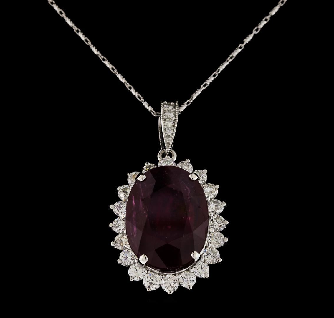 One 14KT White Gold Pendant, Natural Ruby, No Lead Filling, Chain Included. Containing: Gold & Metal Weight: 14KT White Gold, 13.83 grams. Main Gemstones: Identity: Natural Ruby. Carat Weight: 18.81 cts tw. Shape & Measurement: Oval Shape. 19.31 x 14.61 mm. Quality: Natural Ruby, No Lead, Fine Even Color. Adjacent Gemstones: Identity: Natural Diamond. Shape: Round Brilliant Cut. Carat Weight: 3.08 cts tw. Quality: VS Clarity, E-F Color. All fine cutting and proportions. Total Gemstones Weight: 21.89 cts tw. RBGS Appraised.