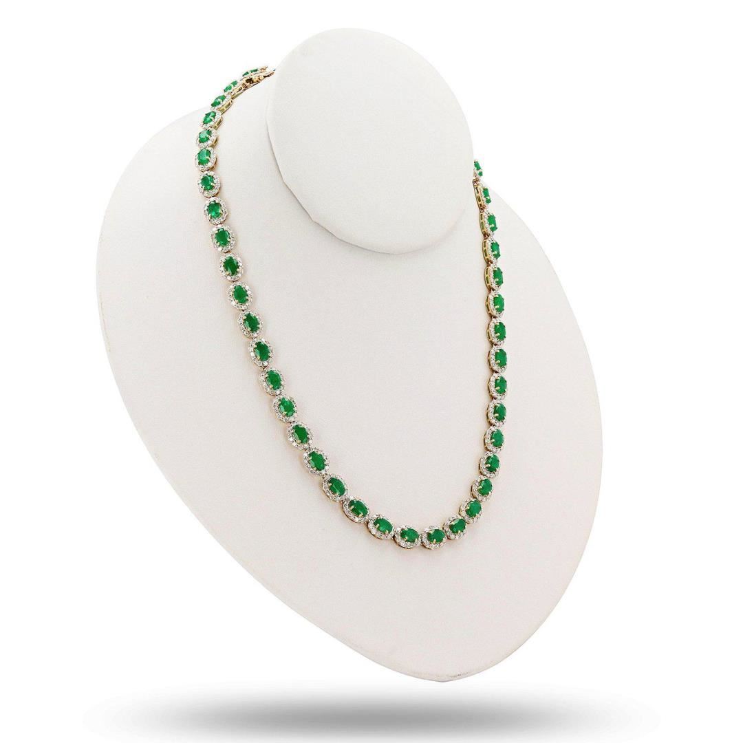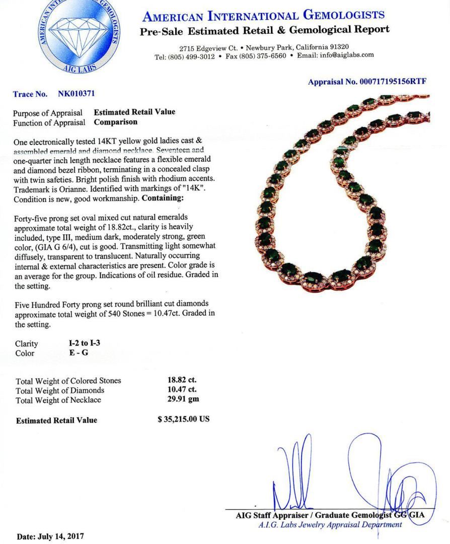 One electronically tested 14KT yellow gold ladies cast & assembled emerald and diamond necklace Seventeen and one-quarter inch length necklace features a flexible emerald and diamond bezel ribbon, terminating in a concealed clasp with twin safeties. Bright polish finish with rhodium accents. Trademark is Orianne. Identified with markings of "14K". Condition is new, good workmanship. Containing: Forty-five prong set oval mixed cut natural emeralds approximate total weight of 18.82ctw., clarity is heavily included, type III, medium dark, moderately strong, green color, (GIA G 6/4), cut is good. Transmitting light somewhat diffusely, transparent to translucent. Naturally occurring internal & external characteristics are present. Color grade is an average for the group. Indications of oil residue. Graded in the setting. Five Hundred Forty prong set round brilliant cut diamonds approximate total weight of 540 Stones = 10.47ctw. Graded in the setting. Clarity I2 to I3 Color E - G Total Weight of Colored Stones 18.82ctw. Total Weight of Diamonds 10.47ctw. Total Weight of Necklace 29.91 gm #LREF-11891