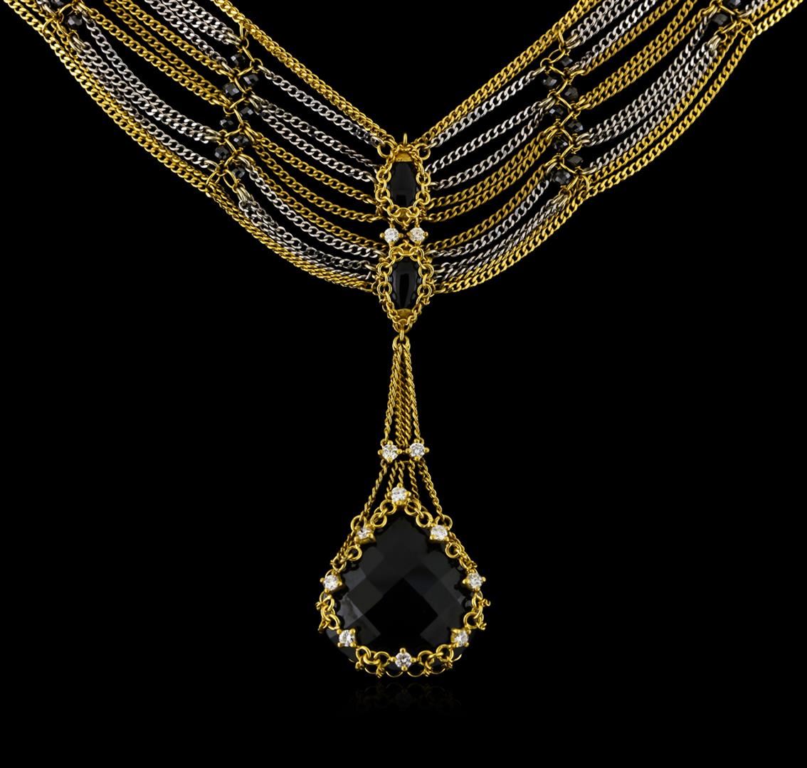 One electronically tested 18KT yellow and white gold ladies custom cast & assembled onyx and diamond necklace with a bright and satin finish. Seventeen and one-half inch wearable length necklace features a dangle consisting of an onyx set within a white diamond accented wrap suspended from a rigid black cabochon and white diamond center. The necklace is supported by multiple yellow gold and white gold draped chains with black diamond beads, transitioning into two onyx bead accents, terminating in a "s" hook clasp. Trademark is ANTHONY NAK. Identified with markings of "18K". Condition is good. Containing: One pear mixed cut natural onyx, measuring 19.00 x 20.00 x 8.00mm, approximate weight of 15.85ct., black, moderately strong, black color, (GIA Bl 10/4), cut is good. Transmitting light very diffusely, opaque. Naturally occurring internal & external characteristics are present. Graded in the setting. Two marquise cut natural onyxs, measuring 10.00 x 4.00 x 2.55mm, approximate total weight of 1.00ct., black, moderately strong, black color, (GIA Bl 10/4), cut is good. Transmitting light very diffusely, opaque. Naturally occurring internal & external characteristics are present. Measurements & the color grade are an average for the pair. Graded in the setting. Two bead set oval cabochon cut natural onyxs, measuring 7.50 x 5.00 x 3.95mm, approximate total weight of 2.08ct., black, moderately strong, black color, (GIA Bl 10/4), cut is good. Transmitting light very diffusely, opaque. Naturally occurring internal & external characteristics are present. Measurements & the color grade are an average for the pair. Graded in the setting. Twelve prong set round brilliant cut diamonds, measuring 2.00 - 1.90 x 1.17mm (depth est.) approximate total weight of 12 Stones = 0.42ct. Graded in the setting. Clarity: SI-1 to SI-2. Color: G - I Forty-Eight bead set bead cut diamonds, measuring 1.50 x 2.40 x 2.40mm (depth est.) approximate total weight of 48 Stones = 2.10ct. Indications of multiple laboratory enhancements. The specific gravity of black diamond is 3.120 to 3.165. Diamond tester results are non-reactive. Graded in the setting. Clarity Déclassé,. Color: Fancy Black; Irradiated. Total Weight of Colored Stones 18.93ct. Total Weight of Diamonds 2.52ct. Total Weight of Necklace 41.85gm. AIG Appraised at $13,450.00.