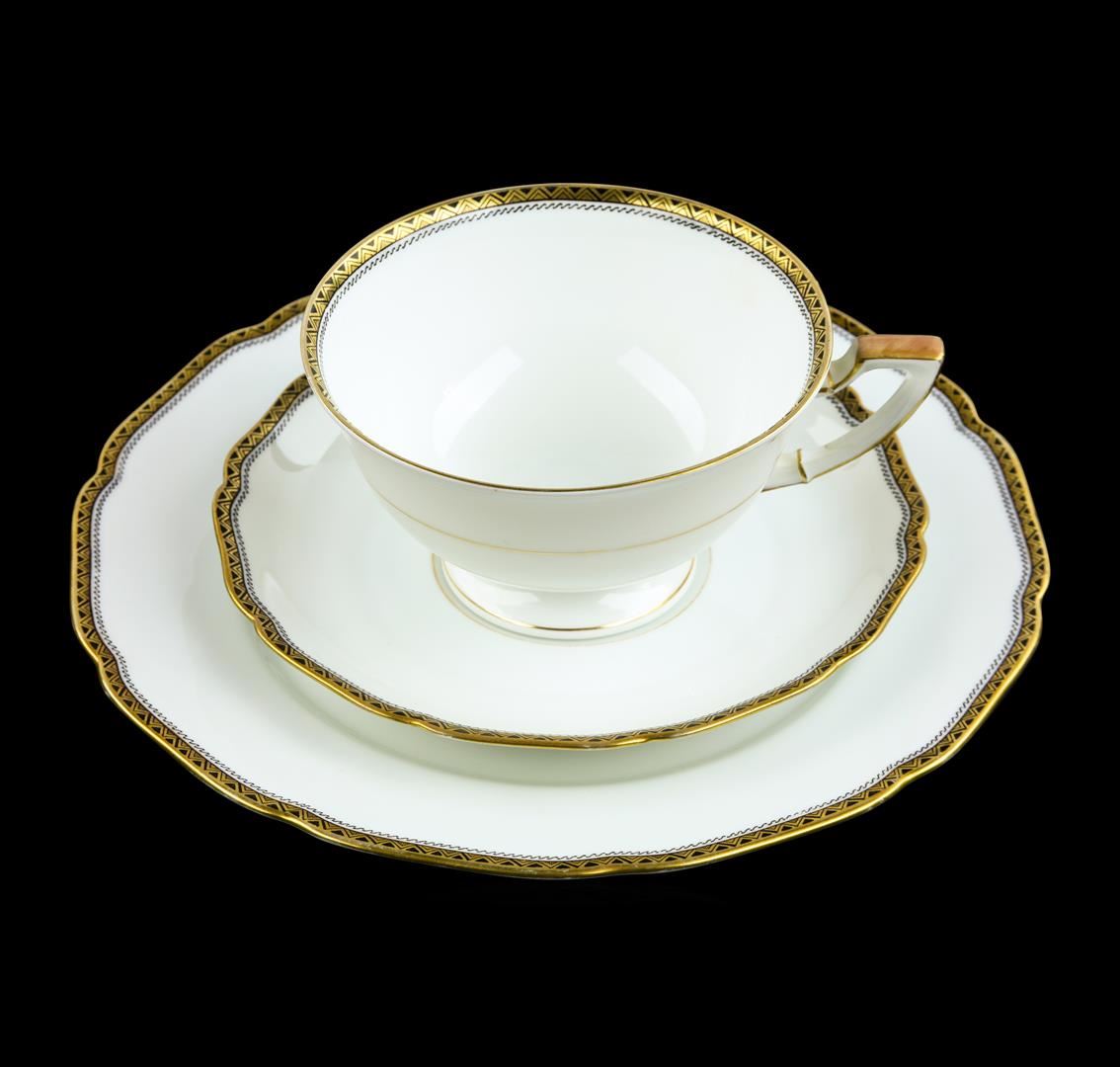 18 piece tea/luncheon Set raised gold encrusted Hutschenreuther Kohenberg Bvavaria. This 18 piece set includes 6 tea cups, 6 saucers, and 6 salad plates measuring 7.75". No chips, cracks, or damage. There is just a bit of rubbing from gentle use.