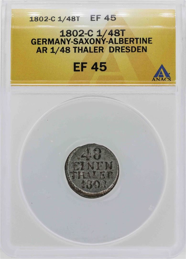 One 1802-C Germany-Saxony 1/48 Thaler Dresden Coin ANACS XF45. ANACS Appraised.