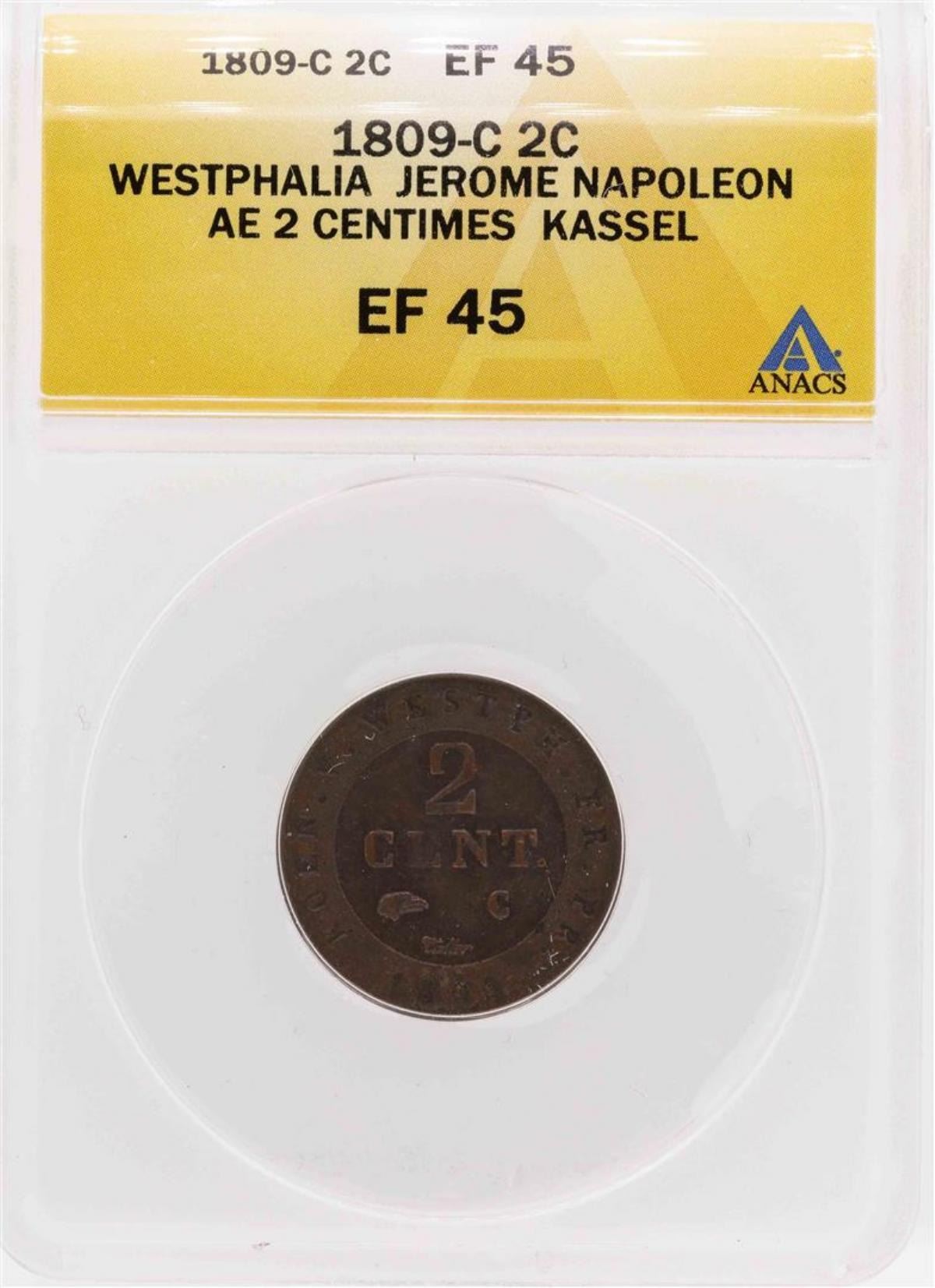 One 1809-C Westphalia Jerome Napoleon Ae 2 Centimes Kassel Coin ANACS XF45.